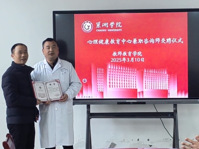 3月10日下午,教师教育学院于艺术楼会议室举行了外聘教师受聘仪式。学院领导班子全员出席,安徽省音协吉他专业委员会副会长徐传辉老师、国家二级心理咨询师虞晓斌与李河发老师参加,音乐表演专业、应用心理学专业部分骨干教师共同参与,仪式由副院长(主持工作)蔡广主持。