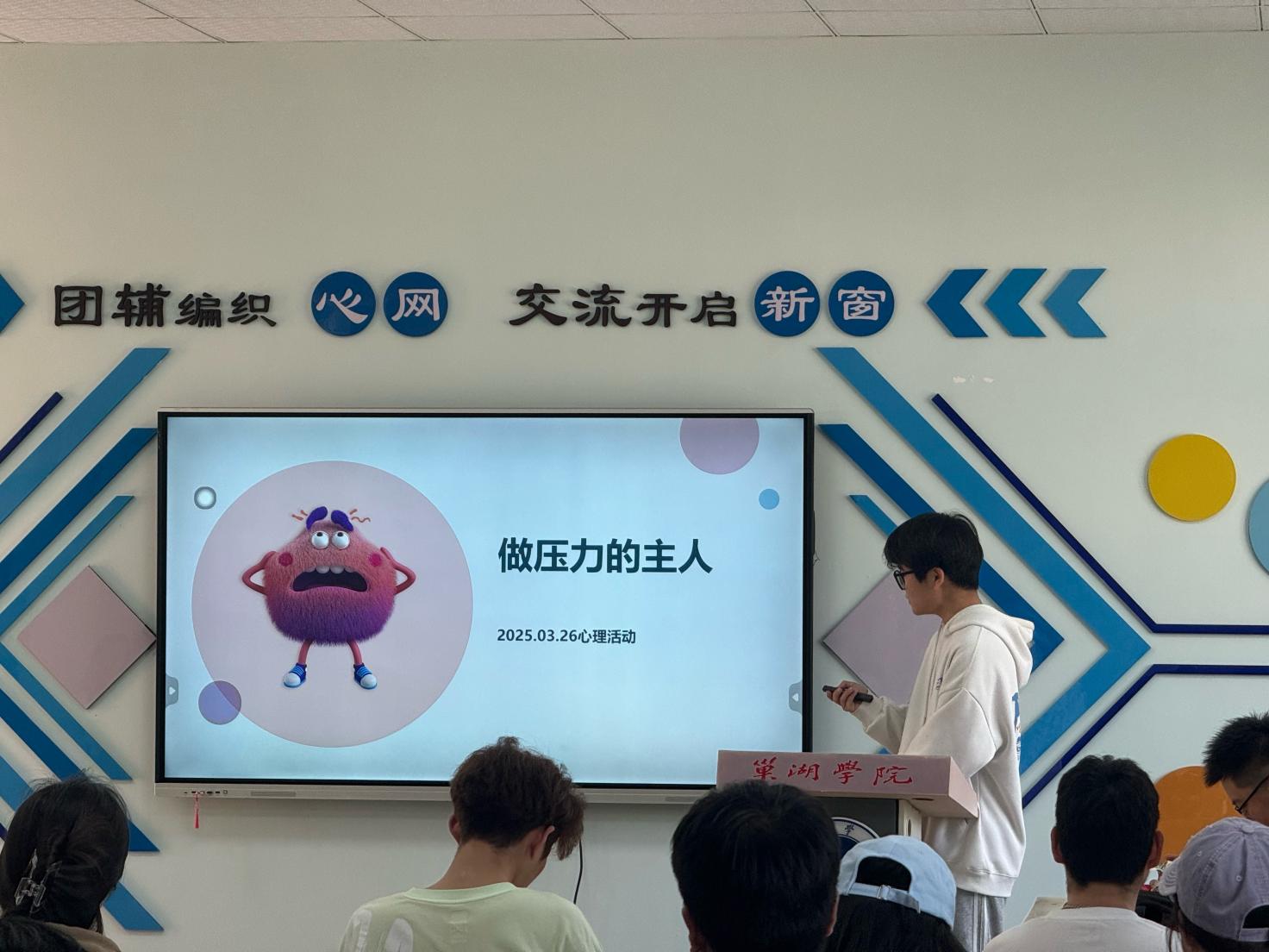 随后,应用心理学缪同学以“压力与情绪调节”为主题展开分享,他结合大学生常见心理案例,深入浅出地讲解了焦虑识别、压力疏导技巧及积极心理暗示方法,并带领同学们体验了深呼吸放松训练。互动环节中,同学们踊跃提问,探讨如何平衡学业与生活节奏,现场氛围温馨而热烈。