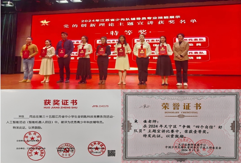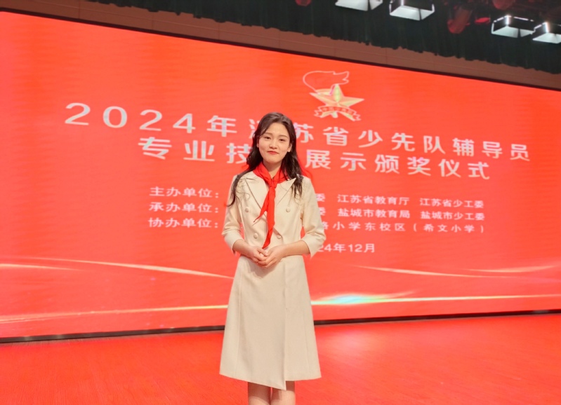 宋佳在2024年江苏省少先队辅导员专业技能展示活动的“党的创新理论宣讲”项目中获得特等奖,并在颁奖活动中作为宣讲项目中的唯一选手面向全省骨干辅导员作现场展示。