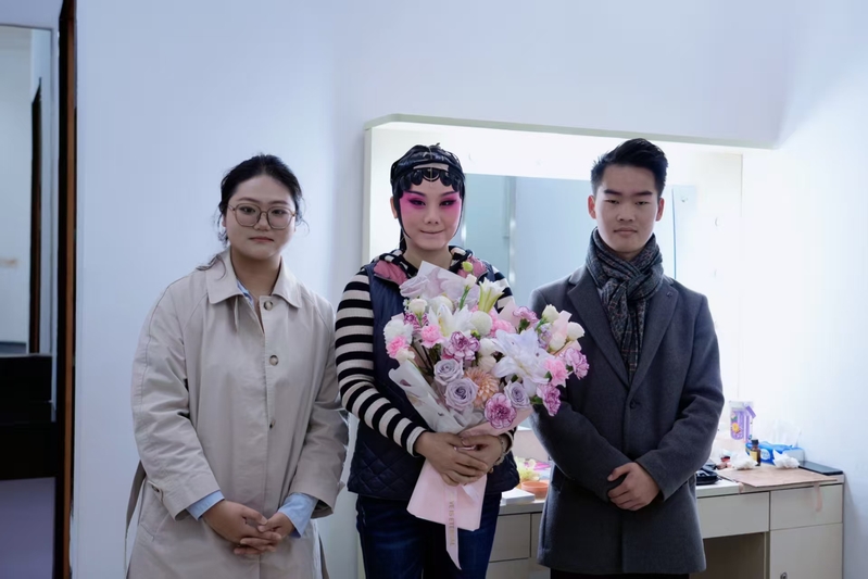 4月13日下午,团队首站抵达合肥大剧院,合肥市庐剧院院长、国家一级演员段婷婷热情接待了师生一行,并带领大家观赏了经典庐剧《刘兰芝》。该剧以精湛的唱腔、细腻的表演和深厚的文化底蕴,展现了庐剧的独特魅力。演出结束后,学生代表徐一丁向段婷婷献花致谢,表达对庐剧传承人坚守艺术的敬意。这一动人场景被安徽电视台记录,成为本次活动的重要影像资料。