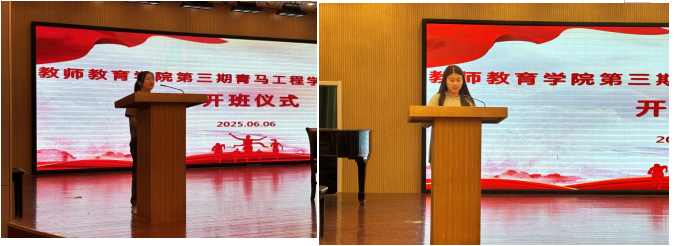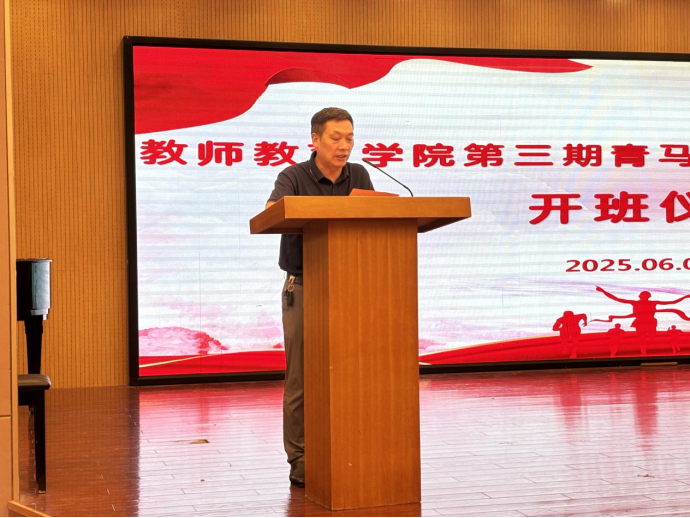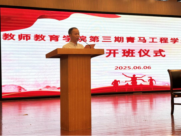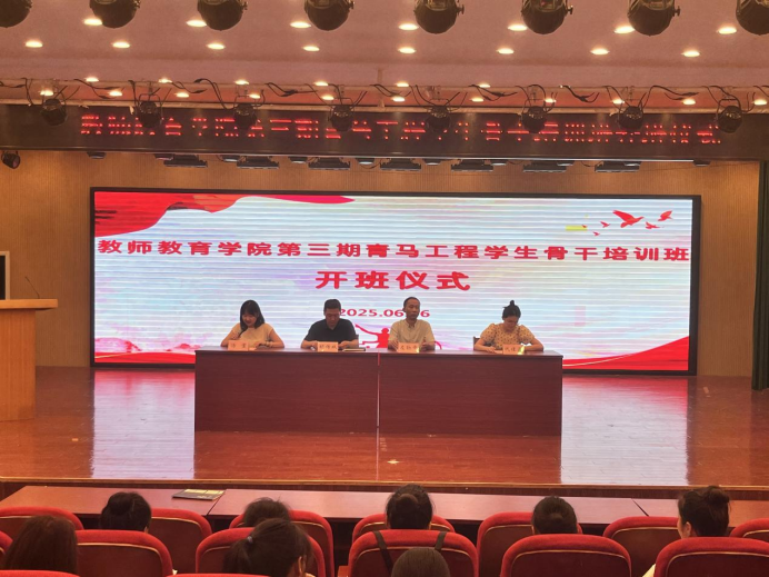 为进一步加强青年大学生思想政治引领,锻造政治坚定、能力突出的学生骨干队伍,6月6日下午,教师教育学院第三期“青马工程”学生骨干培训班在艺术楼报告厅正式开班。学院党委副书记胡传双、左劲中,团委挂职副书记代佳鑫出席,全体学员参加。开班仪式由学院团委副书记汤重主持。