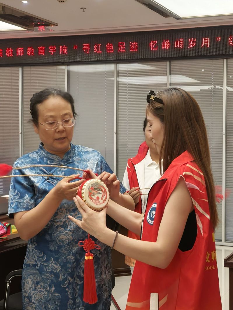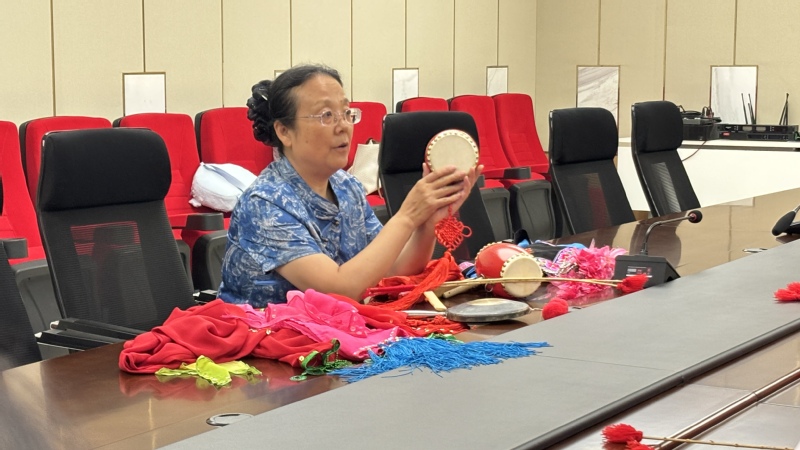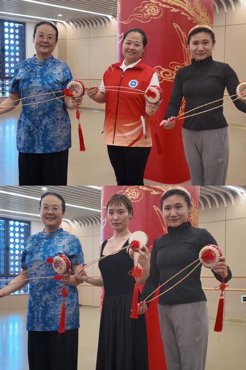 随后,肖老师亲自示范教学,从基础的鼓点节奏到复杂的舞蹈动作,手把手教授刘杨和魏黎丽凤阳花鼓。在肖老师的悉心指导下,两位教师认真聆听、反复揣摩,初步掌握了凤阳花鼓表演的基本技巧。在实践中,两位教师深刻体会到凤阳花鼓动作与节奏中蕴含的韵律美,感受到这一非遗艺术的独特魅力。