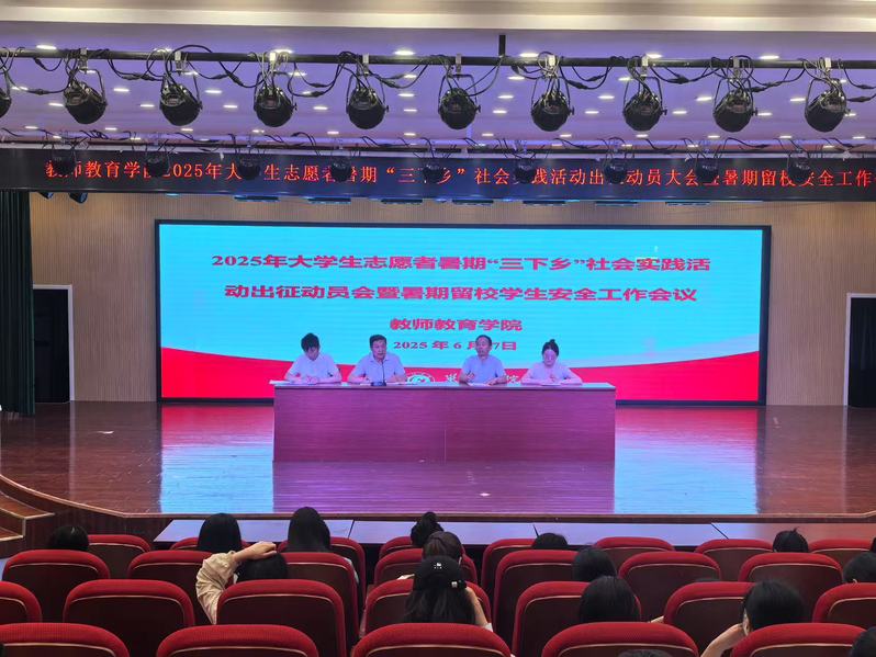 6月27日上午,教师教育学院在艺术楼报告厅召开2025年大学生暑期“三下乡”社会实践出征动员会暨暑期留校学生安全工作会议。学院党委副书记胡传双、左劲中,全体辅导员、社会实践团队指导教师、实践队员及暑期留校学生参加会议。会议由左劲中主持。