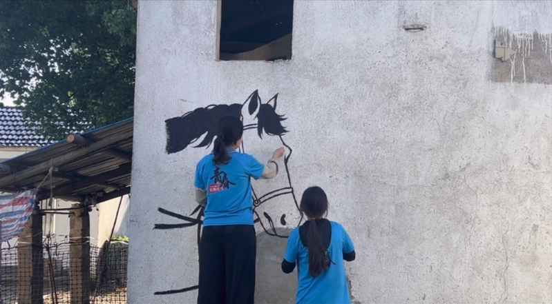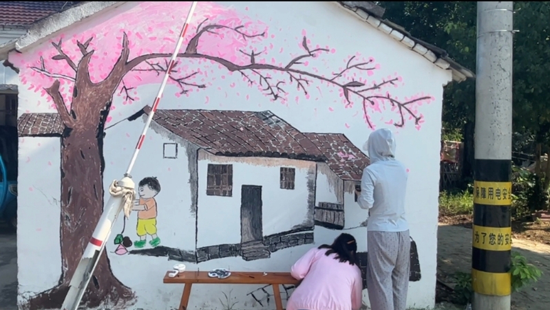 墙绘现场,实践团成员热情高涨地开启墙绘创作。绘画功底扎实的队员勾勒线条、塑造形象,色彩感知敏锐的同学调配颜料配色,善于处理绘画细节的队员做好墙绘结尾工作。每个同学分工协作,虽头顶烈日、汗流浃背,但依然专注于墙面绘画,一笔一划描绘乡村美好愿景。从民俗故事里的经典场景,到展现乡村新貌的创意构图,一幅幅作品在墙壁上逐渐鲜活,为原本朴素的乡村建筑增添一份艺术活力。
