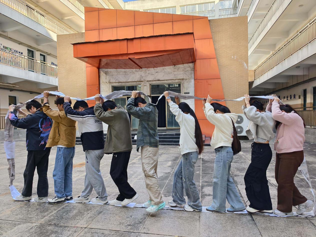 活动伊始,“大小西瓜”破冰游戏迅速活跃现场氛围。新生们围成一圈,在“说大比小、说小比大”的趣味规则中比拼反应能力、欢笑不断,消解了初识的羞涩与陌生感,快速拉近了彼此距离。随后的团队协作环节将活动推向高潮,“无敌风火轮”任务中,各小组分工明确,利用报纸和胶带默契搭建“履带”,在共同商议、相互配合中稳步向终点迈进,展现了新生们的团队凝聚力与执行力