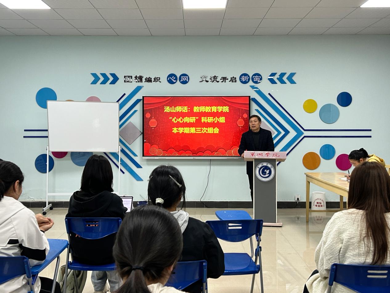 教师教育学院“心心向研”科研小组于20251113日晚在艺术楼二楼团辅室迎来了新一期组会。本次组会由24级应用心理学专业高梦然同学主持,教师教育学院党委书记胡传双莅临指导,应用心理学专业教师朱平刘宾和管锦亮参加。