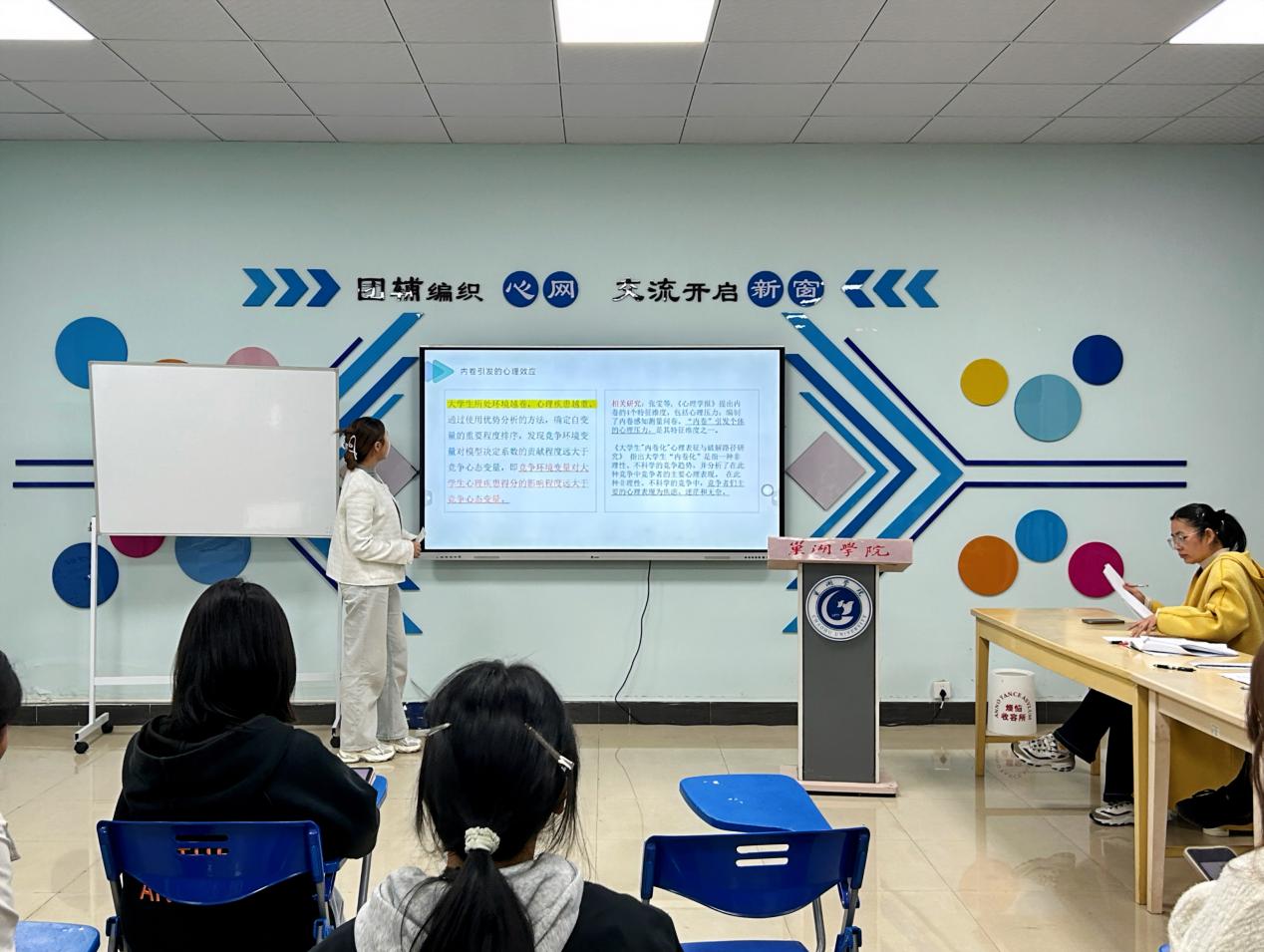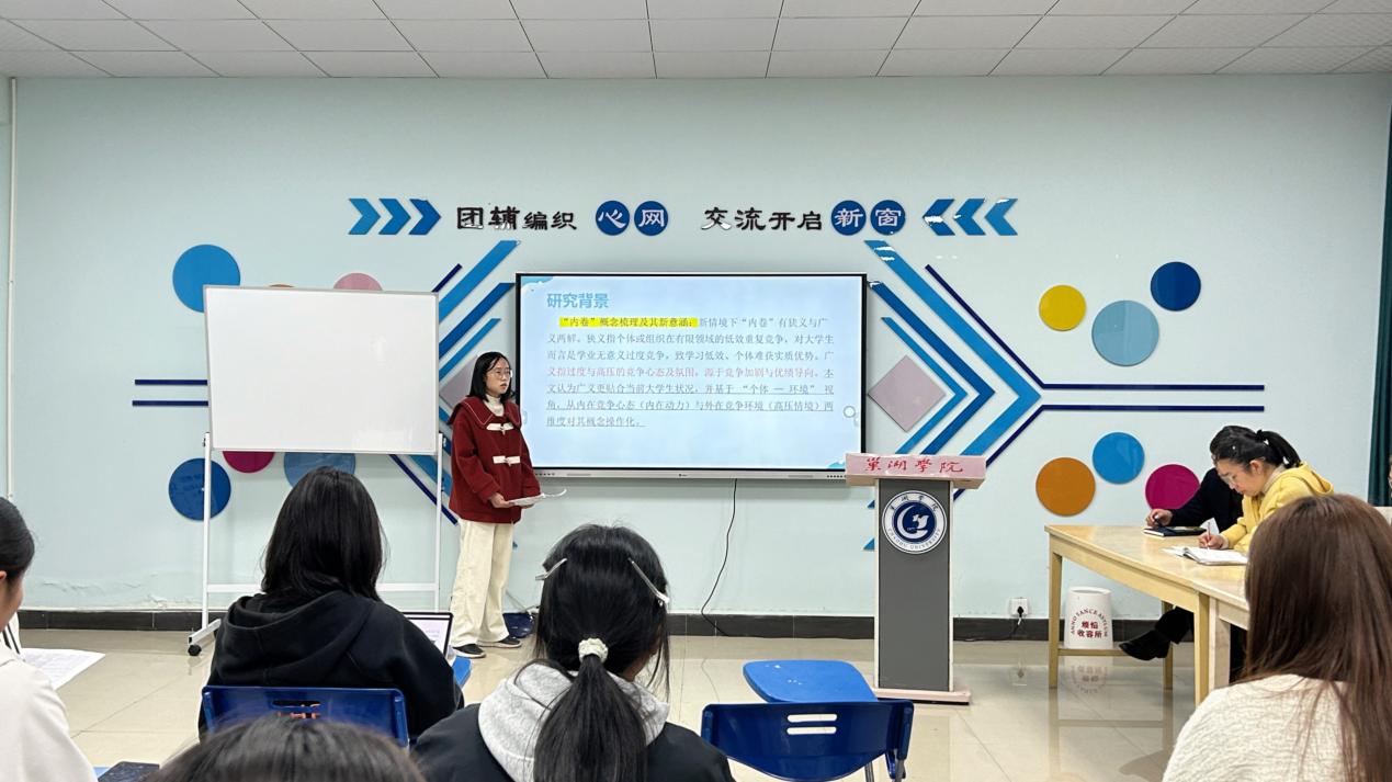 在文献汇报环节,王睿瑾同学以《内卷对大学生心理健康的多重影响效应研究》为主题,从研究背景、对象、方法及内容等维度展开分享,探究“内卷”的心理效应、个体-环境匹配机制及社会支持的调节作用。汇报后,同学们积极提问,王睿瑾逐一解答,现场交流氛围热烈