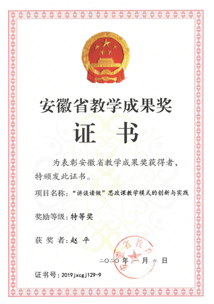 我院教师赵平教授于2020年1月以主要参与人身份荣获安徽省教学成果奖特等奖。项目名称:“讲谈读做”思政课教学模式的创新与实践。