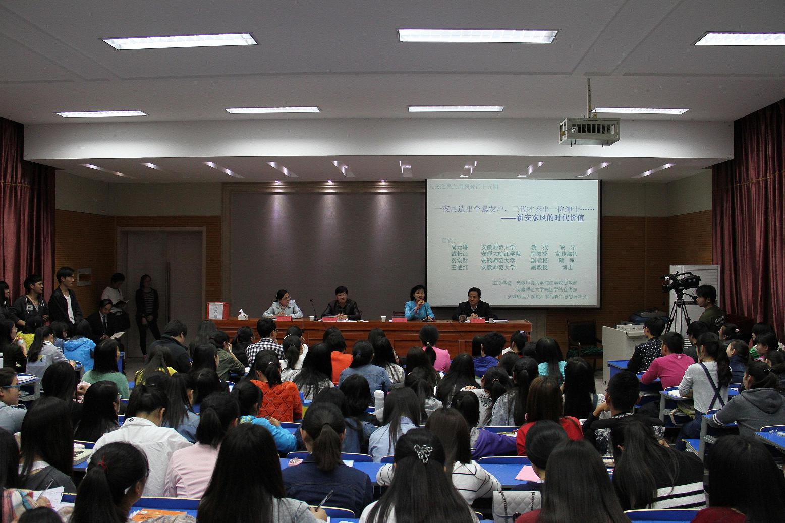 本网讯 4月22日晚,由思想政治理论教研部、党委宣传部和青年思想研究协会联合举办的“人文之光”系列活动第十五期“新安家风的时代价值”在学术报告厅举行。安徽师范大学文学院教授周元琳,皖江学院宣传部部长戴长江,安徽师范大学副教授秦宗财、王艳红做客“人文之光”,与皖江学子以及学生家长一起走进历史上的新安,感受新安家风的独特魅力。