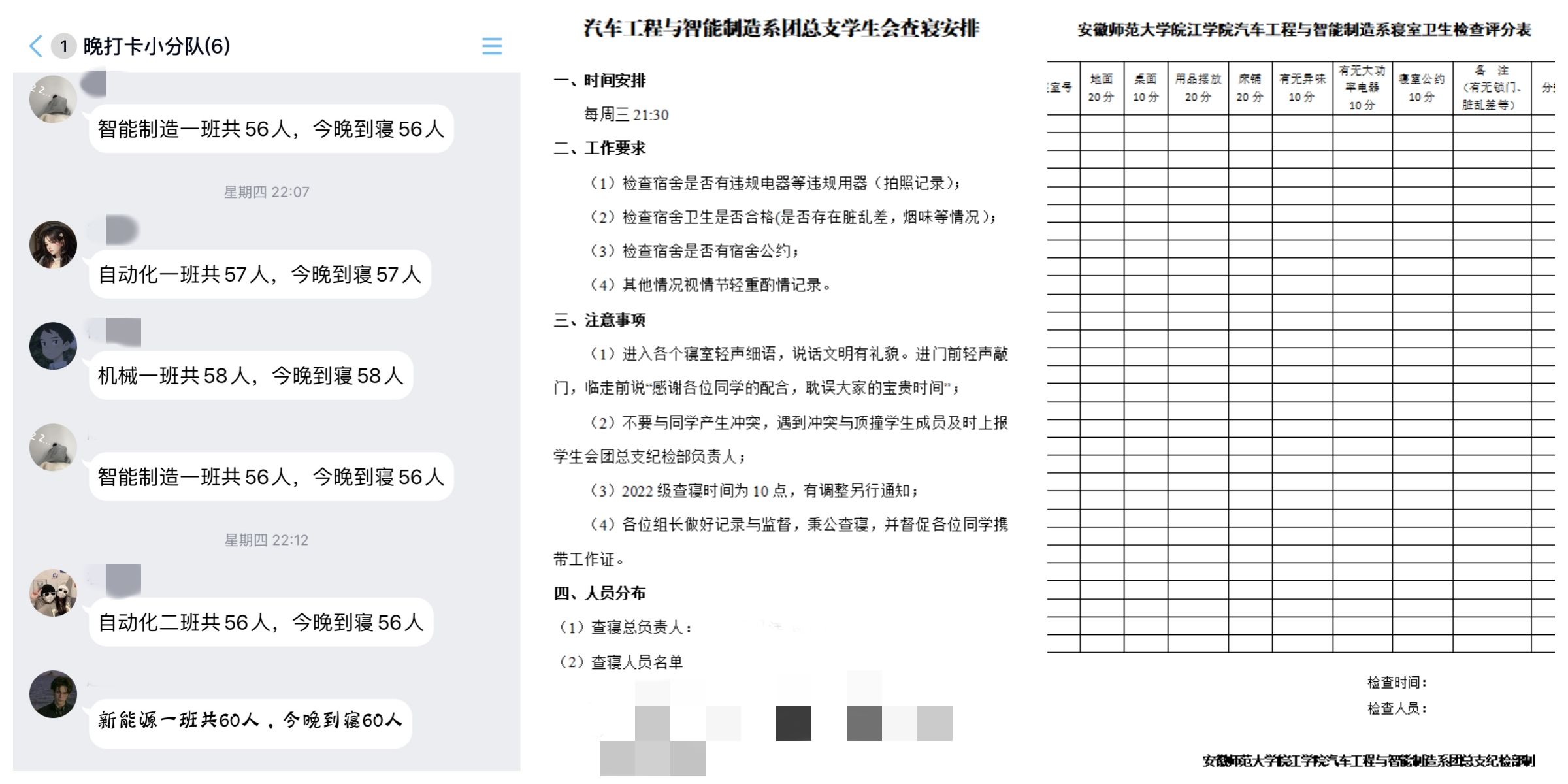 为加强学生寝室管理,各班级辅导员定期深入学生宿舍,开展春季寝室安全排查与卫生大检查工作。走访过程中,提醒同学们严禁使用违规电器,不私接、乱拉电线,避免出现安全隐患;要求寝室成员及时清理生活垃圾营造安全卫生、文明有序的宿舍环境。此外,团总支学生会相关部门定期开展宿舍安全卫生检查,并对检查结果进行公示。各班级安全委员、寝室长严格实行每晚点名制度。寝室排查工作常态化推进,学生自我教育、自我管理、自我服务意识有所提高