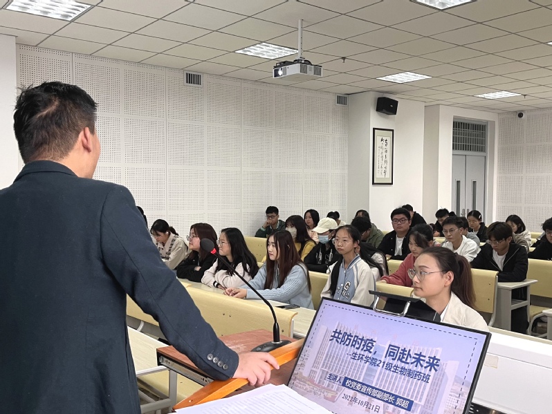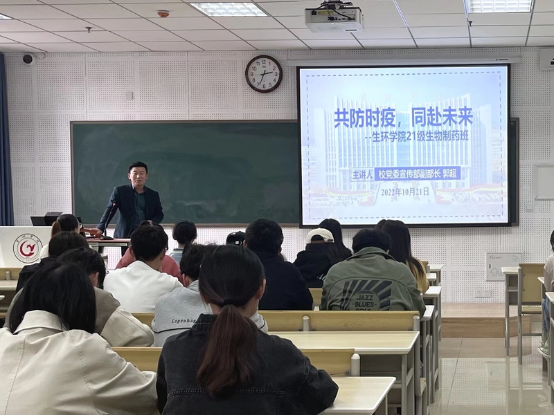 为贯彻落实必赢76net官网领导干部联系班级制度,10月21日下午,校党委宣传(统战)部副部长郭超在崇学楼中301教室参加并指导了生物与环境工程学院2021级生物制药专业“共防时疫,同赴未来”主题班会。班会由辅导员潘晨主持,2021级生物制药班全体同学参加。