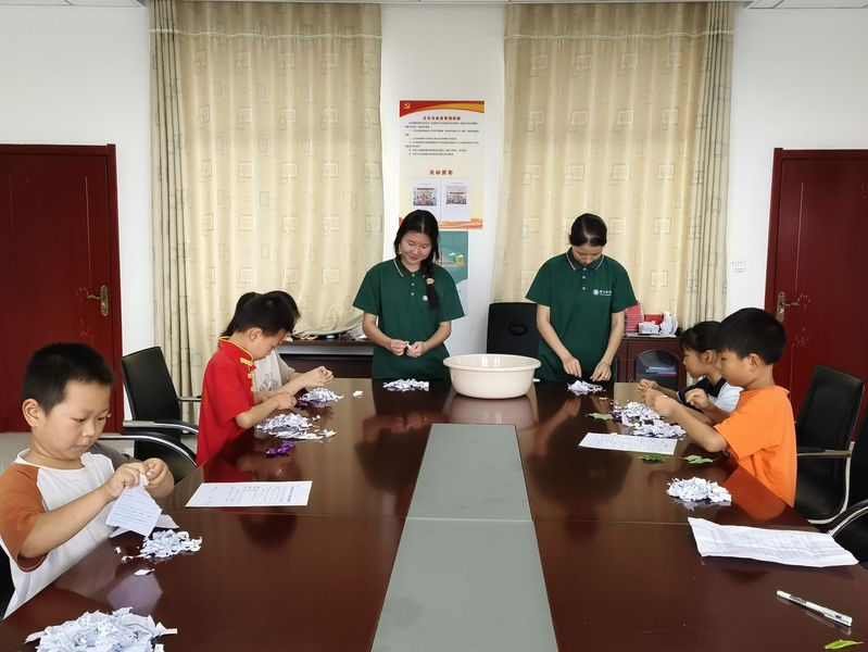 下午,志愿者们带领小朋友们开展了一场别有生趣的“变废为宝,废纸再生”手工实践活动。在志愿者们的指导下,孩子们先把废报纸撕成碎纸,将碎纸浸泡在水里,再用工具将废纸搅拌成纸浆,经过搅拌、分离、平铺、自然晾干等一系列步骤之后,一幅幅再生纸在孩子们手中诞生。孩子们纷纷表示,“废纸真的再生了”“太神奇了”,伴随着一声声的惊叹,环保的理念在孩子的心中生根发芽……