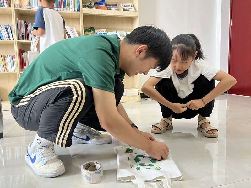 7月20日,宣讲团前往松店村村委会活动中心开展植物拓印趣味活动。志愿者们向小朋友们讲解有关植物拓印的知识,带领他们将浸泡明矾水的植物擦干,按自己的想法铺排在帆布袋上,用透明胶固定,用小锤子将植物的汁水敲打出来,制作自己独一无二的“印记”,小朋友们在活动中发挥了创造力和想象力,增强他们作为地球小公民的责任感。