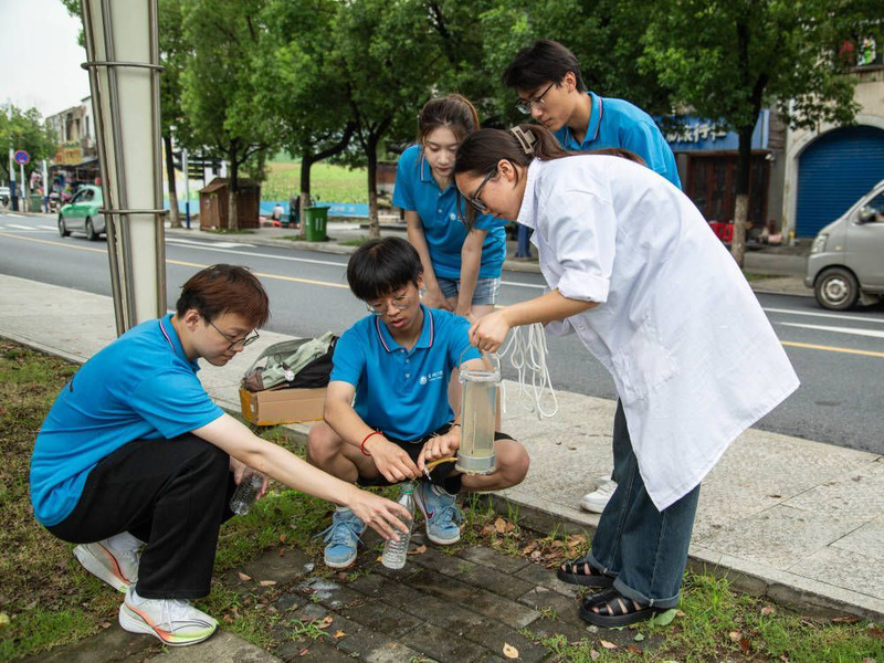 7月15日,实践团队前往岗岭社区开展以保护水资源为主题的支教活动,志愿者们通过“你测酸碱我来猜”“自制简易自来水过滤器”等趣味生物实验活动,展示保护水资源的重要性。团队还在半汤街道温泉社区、战前村等地开展问卷调查,调研居民日常水资源使用情况,宣传水资源节约和保护相关知识,增强居民环保意识。
