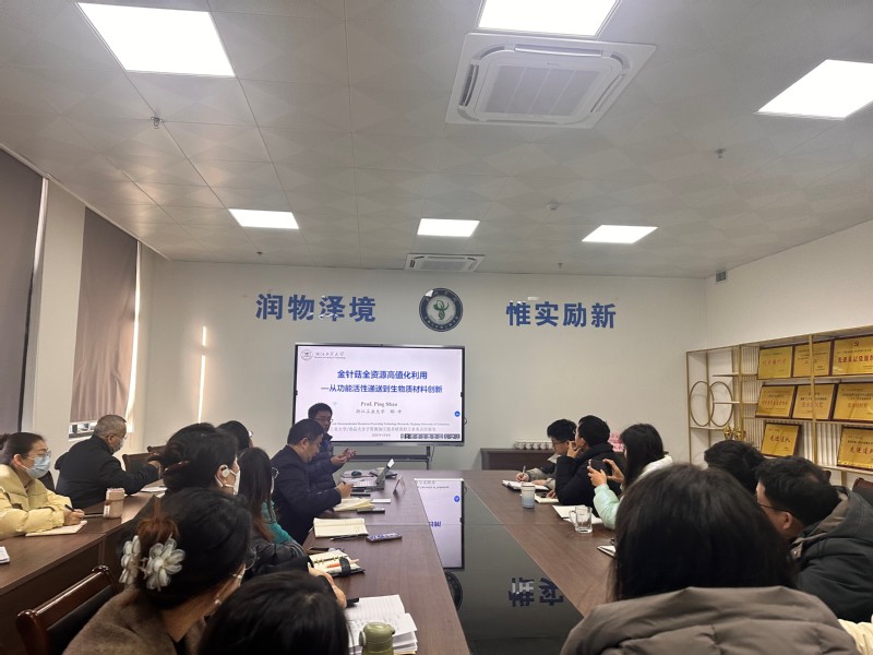 首先,邵平教授在生环学院会议室作了题为“柠檬风味载体制备及其在酸性饮料中应用初探”的学术报告。另外,邵平教授又将研究团队最新的研究成果进行了分享,从研究思路、选题背景、意义及应用场景、研究结果等方面详细介绍了金针菇全资源高值化利用相关的研究进展。邵平教授以实际行动践行了“论文写在产品上,成果转化在企业里,与行业同频共振”的思路理念,强调应将技术研发与企业需求相契合。邵平教授的报告内容丰富、深入浅出、生动精彩,让与会人员对于如何更好地发挥中心专业优势、助力企业发展有了新的思路和方向。