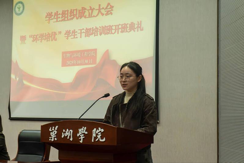 典礼在庄严的团歌声中拉开序幕。任梦溪宣读了新一届学生组织主席团成员名单,并介绍了“环学培优”学生干部培训班教学安排。她指出,本次培训以“理论学习+实践锻炼+交流研讨”为核心模式,聚焦学生工作实务、沟通协调技巧等重点内容,旨在全面提升学生干部的综合素质与服务能力。