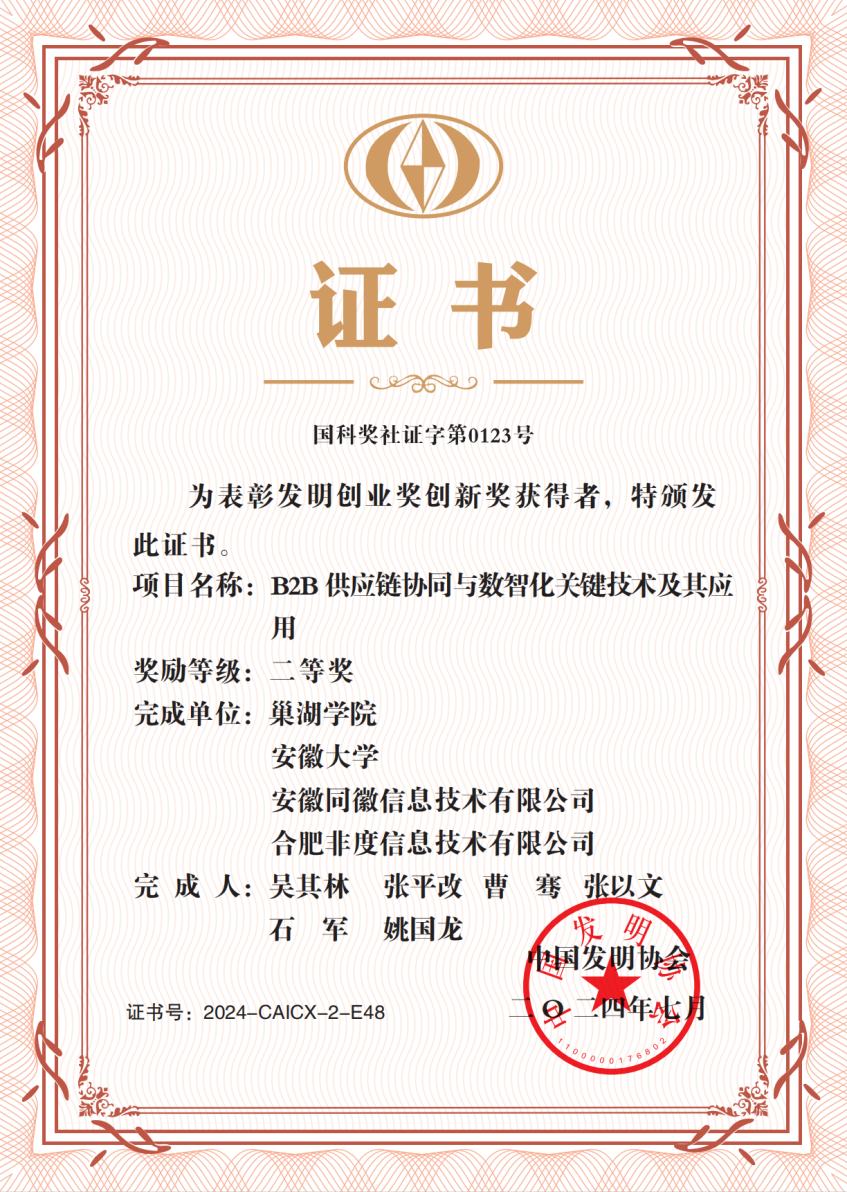 近日,中国发明协会颁发了2024年度发明创业奖证书,必赢76net官网作为第一完成单位、吴其林教授作为第一完成人的“B2B 供应链协同与数智化关键技术及其应用”项目获得发明创业奖创新奖二等奖。