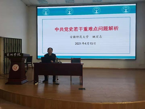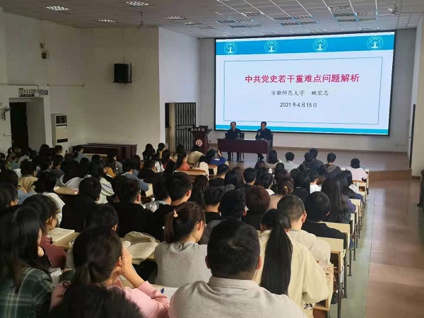 为深入贯彻习近平总书记关于党史学习教育的重要讲话精神,全面开展党史学习教育。4月15日下午,安徽师范大学马克思主义学院院长、博士生导师姚宏志教授应邀在求实楼报告厅,为我校师生作了题为“中共党史若干重难点问题解析”的学术报告。370余名学生和部分思政课教师聆听了报告。