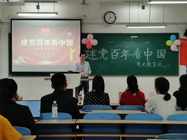 6月9日下午,“建党百年看中国”党史微宣讲比赛决赛在慎思楼中301教室拉开了帷幕。担任本次比赛评委的是马克思主义学院赵光军、董颖鑫、王红丽、夏明群、过慈明、吴多智六位老师。副院长赵光军致开幕词,100余名同学观看了比赛。
