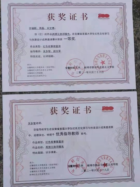 马克思主义学院高度重视,积极组织参赛。紧密结合《纲要》课、《概论》课实践教学活动,经过授课老师遴选,最终三名同学被推荐参加比赛,并全部获奖。由吴多智老师指导的两位学生参加红色故事微宣讲类比赛,喜获一等奖和二等奖。分别是,2020级计算机科学与技术专业许福新的作品“两弹元勋邓稼先”获得一等奖,2020级网络工程专业朱伟民的作品“理想信念的伟大远征——长征颂”获得二等奖。另外,章琪同学的作品“池州烈士陵园开展党史教育工作专题调研报告”获得理论研究类三等奖。吴多智老师获优秀指导老师奖。