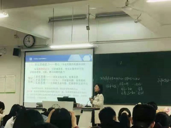 王红丽老师以“学习唯物辩证法,不断增强思维能力”为主题进行示范教学。上课伊始,她从总体上强调唯物辩证法是唯物主义、辩证法和认识论的统一,是认识世界和改造世界的根本方法,接着重点讲授了“五大思维能力”。其中,辩证思维能力是核心,包含求实思维、矛盾思维、发展思维,决定事物发展的质量和成败,要求一切从实际出发,实事求是,用联系与发展的眼光看问题。战略思维能力是统领,包含全局思维和前瞻思维,决定事物发展的方向和层次,要求用全局眼光把握事物发展的方向与大势,落叶知秋,见微知著。历史思维能力是基础,包含后瞻思维和发展思维,决定事物发展的路径和信念,要求以史为鉴、知古鉴今。创新思维能力是动力,体现思维的创新性、灵活性、开拓性,决定事物发展的速度和潜力,要求突破思维定势,综合运用多种思维方法,研究新情况、解决新问题、创造新经验、开创新局面。底线思维能力是原则,包含风险思维和积极思维,决定事物发展的标准和尺度,要求居安思危,界定底线,化危为机,把握主动。最后,组织学生展开“新冠肺炎抗疫饱含着什么样的哲学意蕴?”主题讨论,解读了“五大思维能力”在新时代党的治国理政中的重要作用及其对马克思主义中国化时代化的影响。