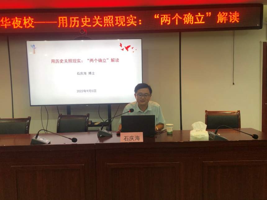 9月5日,应巢湖市城市管理局邀请,石庆海老师为该局“芳华夜校”作了题为《用历史关照现实:“两个确立”解读》的专题讲座。讲座由陶学勇副局长主持,城管局青年骨干40余人聆听了此次讲座。