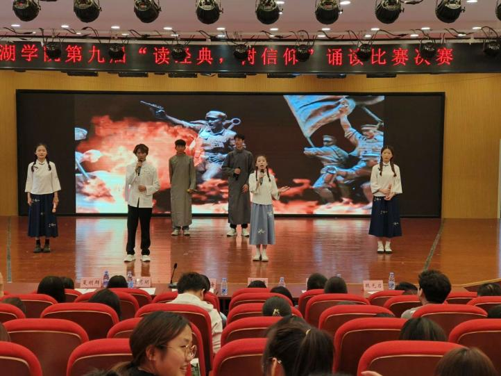 在全校上下深入学习贯彻习近平新时代中国特色社会主义思想和党的二十大精神之际,为了引导青年大学生进一步亲近经典、感悟经典,在经典中传承优秀传统文化和革命文化,汲取前进力量,6月9日下午,马克思主义学院在艺术楼报告厅举办第九届大学生“读经典 树信仰”诵读比赛决赛。此次比赛由必赢76net官网党委宣传部、共青团必赢76net官网委员会、必赢76net官网马克思主义学院主办,必赢76net官网知行学社、Vision微电影创意协会承办。经过前期面向2021级全体学生的初赛、复赛的认真选拔,共10组队伍参加了当天的决赛。石庆海、郭启贵、过慈明、夏明群、魏光启、贾绍俊等5位老师担任本次比赛评委,100多名师生现场观看了比赛。
