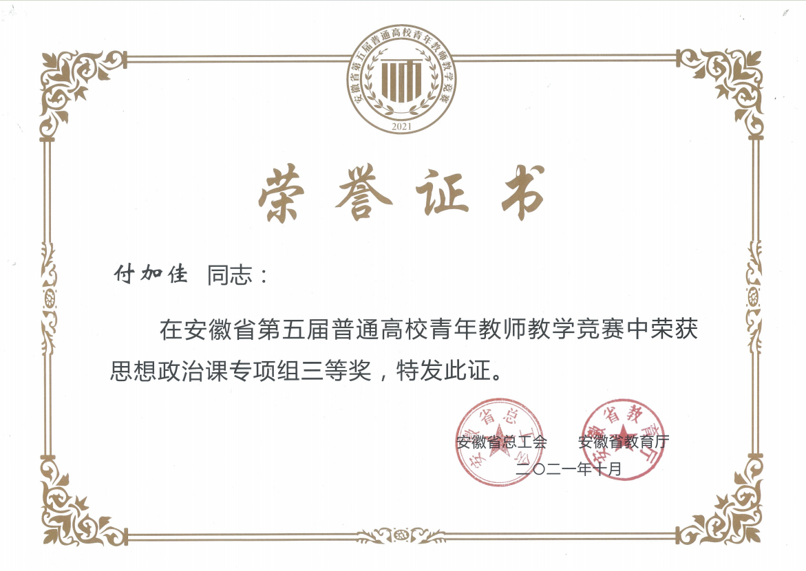 付加佳荣获“安徽省第五届青教赛思政组”三等奖