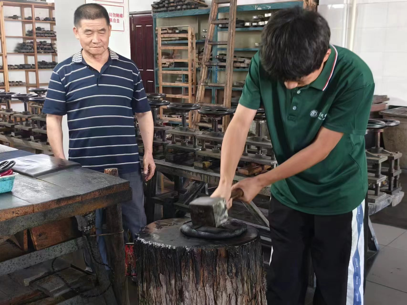 “新时代墨厂发展要迎合时代潮流,不断研发创新,但创新不能忘本,要坚持古法制墨。”徽墨制作技艺传承人汪爱军先生向调研团成员介绍道。当前墨厂的每一块墨依旧严格经过点烟、和料、制墨、晾墨和描金等工序,正是百年如一日的匠心坚守,才有胡开文墨业如今的成就。