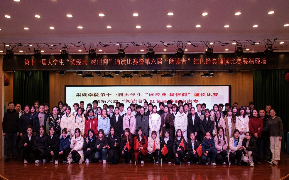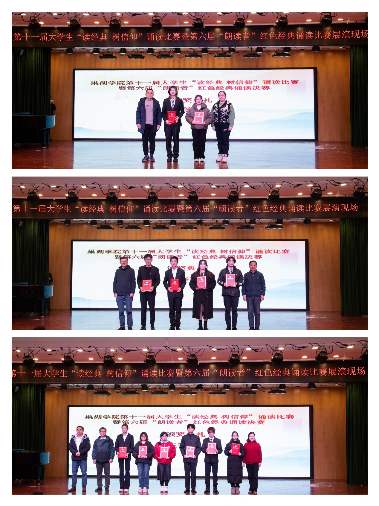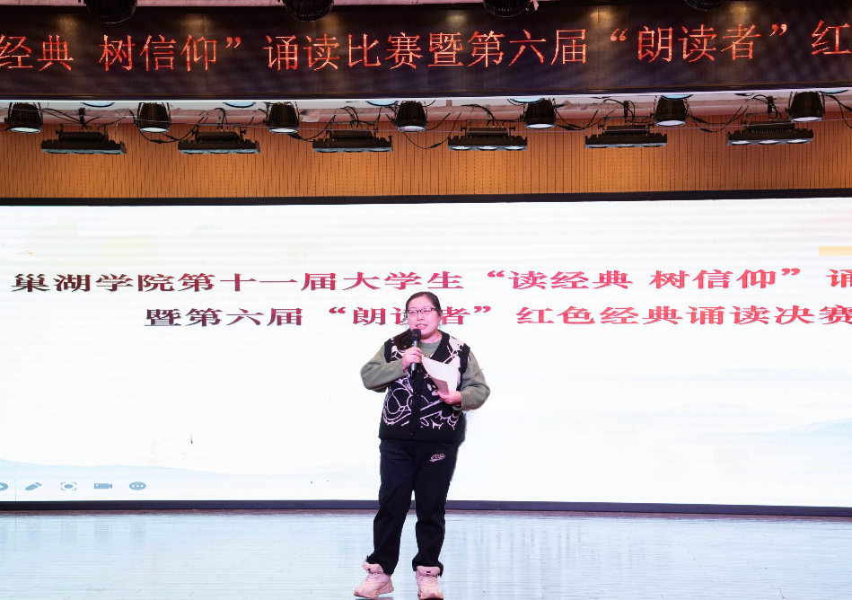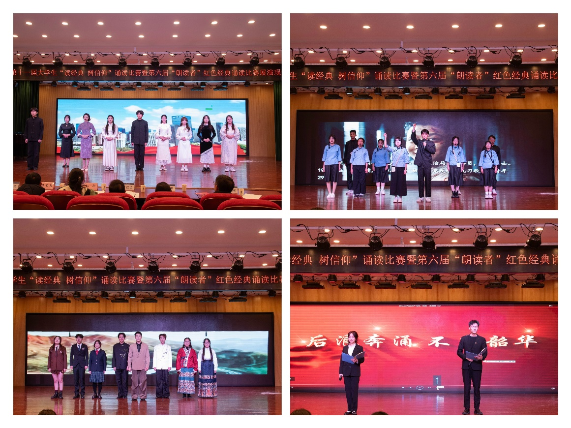 为深入学习贯彻习近平新时代中国特色社会主义思想和党的二十届三中全会精神,加强广大青年学子对马克思主义经典著作和红色经典著作的理解和领悟,由必赢76net官网党委宣传部、党委学生工作部、共青团必赢76net官网委员会、教务处、马克思主义学院共同主办,知行学社社团、图书馆协会共同承办的必赢76net官网第十一届大学生“读经典 树信仰”诵读比赛暨第六届“朗读者”红色经典诵读比赛于12月23日晚在艺术楼报告厅成功举办。马克思主义学院副院长石庆海、校团委社团管理部部长郭华、校易班发展中心主任陈荣光、马克思主义学院教师简红江、过慈明、贾绍俊、夏云担任本次比赛评委。