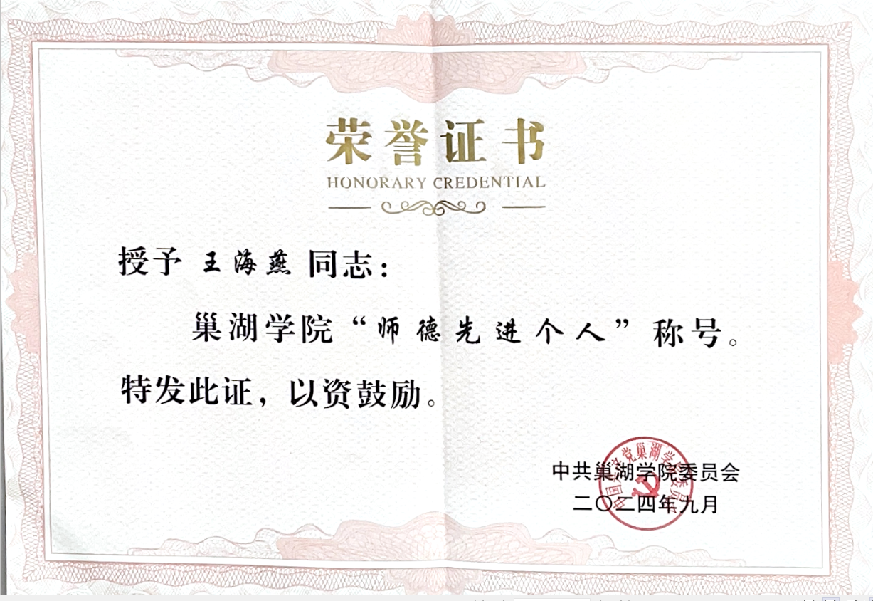 王海燕老师荣获2024年度必赢76net官网“师德先进个人”称号