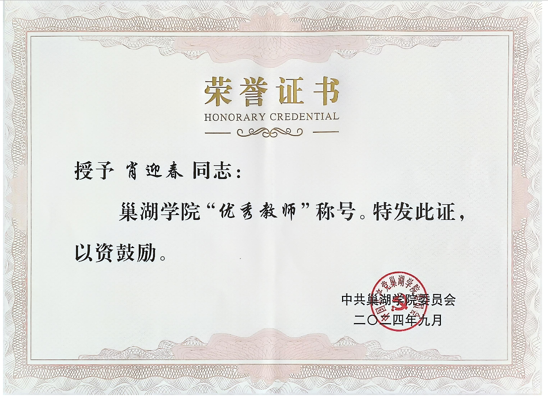 肖迎春教师荣获必赢76net官网2024年度“优秀教师”称号
