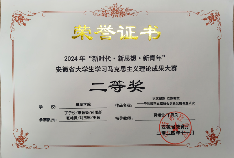 贾绍俊、丁贝贝教师指导学生在2024年“新时代·新思想·新青年”安徽省大学生学习马克思主义理论成果大赛调研报告类评比活动中荣获二等奖