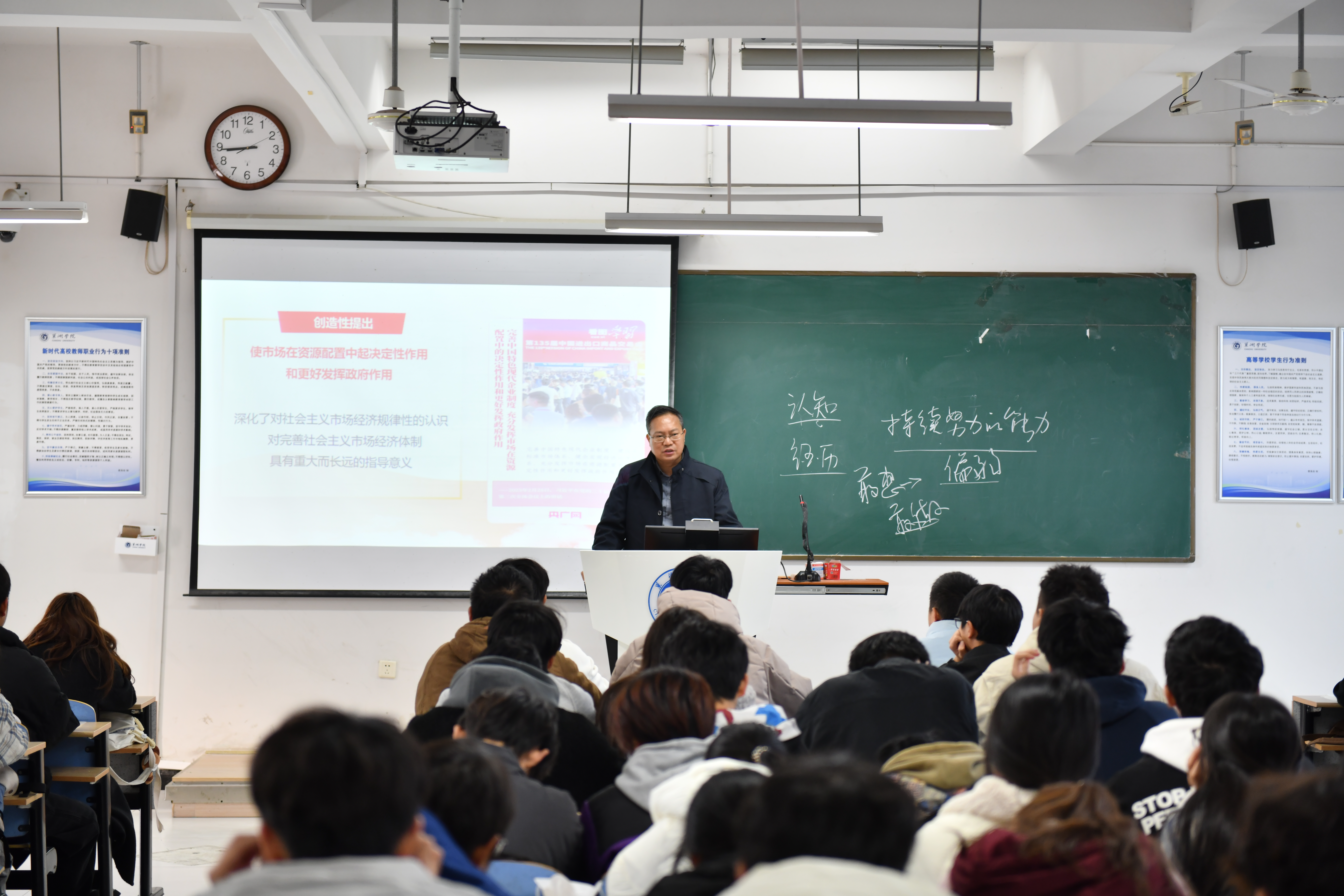 2024年12月13日,校党委委员、副校长周祥为旅游管理学院2024级酒店管理(中爱合作)班和电子工程学院2024级应用心理学班学生讲授形势与政策课。周祥首先以“党的二十届三中全会为什么会备受瞩目”问题导入,对1978年以来历次三中全会的主题及其重要性进行了梳理,接着在分析党的二十届三中全会总体框架基础上强调此次会议通过的决议是中国共产党历史上又一重要纲领性文件,最后从“怎么看”“怎么干”“怎么抓”出发,着重阐释了进一步全面深化改革的重大意义、总体要求、整体思路和根本保证。周祥的授课以学生熟悉的案例展开,紧扣专业成长和职业生涯规划,通过启发性教学与他们互动交流,晓之以理,动之以情,对学生未来就业及其认知提升起到了积极的帮扶作用。他指出,为深入贯彻落实党的二十届三中全会精神,新时代大学生应该努力加强理论学习,提高政治素养;理论联系实际,积极投身实践;培养创新精神,提升综合素质;强化自我革命,不断提升本领。