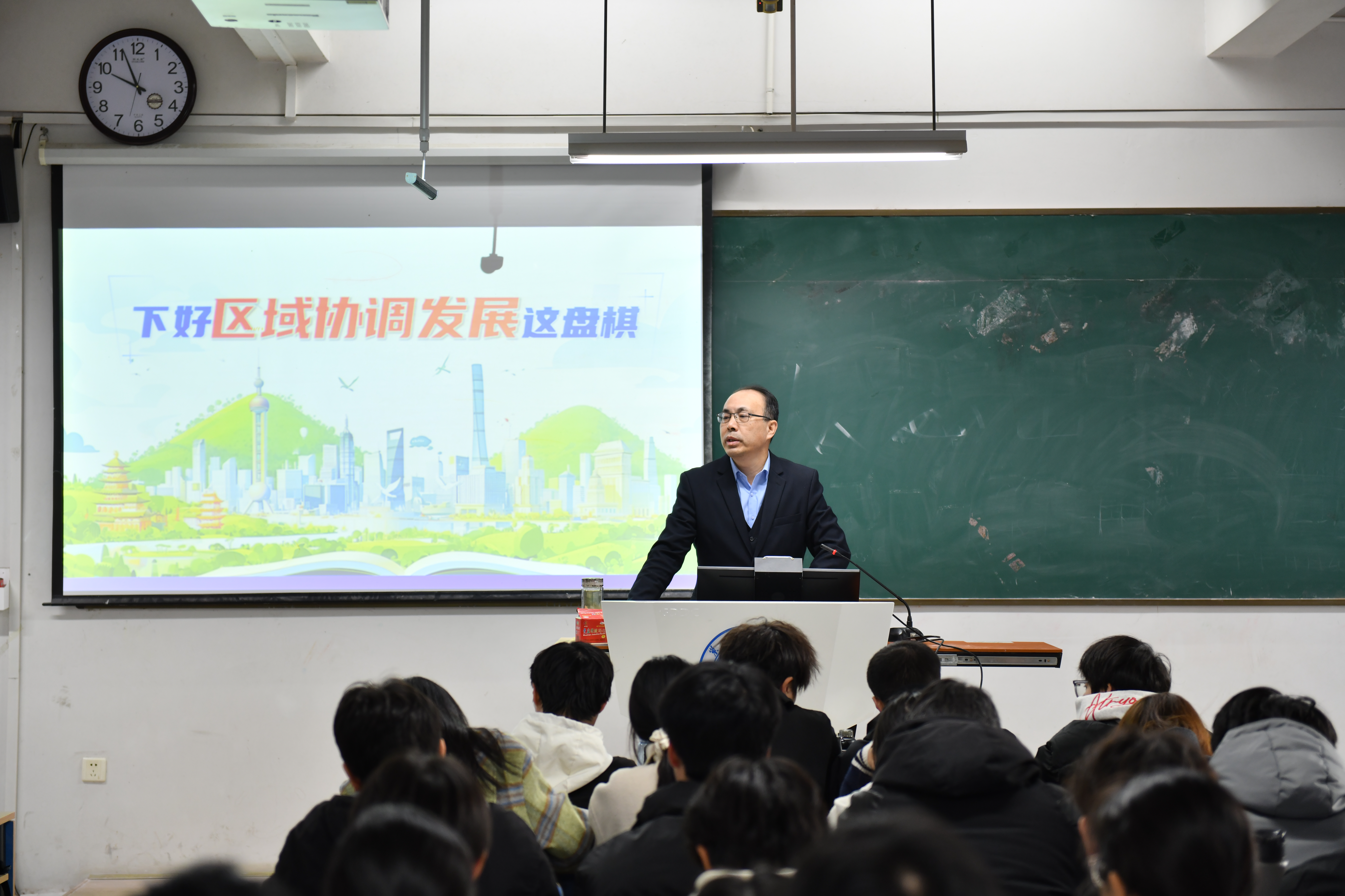 2024年11月27日,校党委委员、副校长丁俊苗为数学与大数据学院2023级数学与应用数学班学生讲授形势与政策课。丁俊苗以“下好区域协调发展这盘棋”为主题,从“全国一盘棋 协调重全局”“洞悉大棋局 把握新形势”“落子循章法 瞄准高质量”三方面带领同学们全面把握我国区域发展取得的成就和面临的挑战,引导他们深入理解推动区域协调发展向更高水平迈进的实现路径。他将西北干旱、东北人才流失、长江禁渔、马六甲对于新加坡经济发展的重要性等宏观案例和学校人才招聘、学生网络行为等微观事例有效融入教学进程。丁俊苗的授课循序渐进,重点突出,声情并茂,深入浅出,使学生们获益匪浅。最后,丁俊苗寄语青年学子:要拓宽视野,积极为区域协调发展做贡献;要为理想持续努力,不能自我设限;要志存高远,以朝气蓬勃、敢为人先的斗志不断追求进步;要坚持学习为上,追求卓越,努力成为优异、优秀和最好的学生;要有坚定的信仰,并能够随机应变。