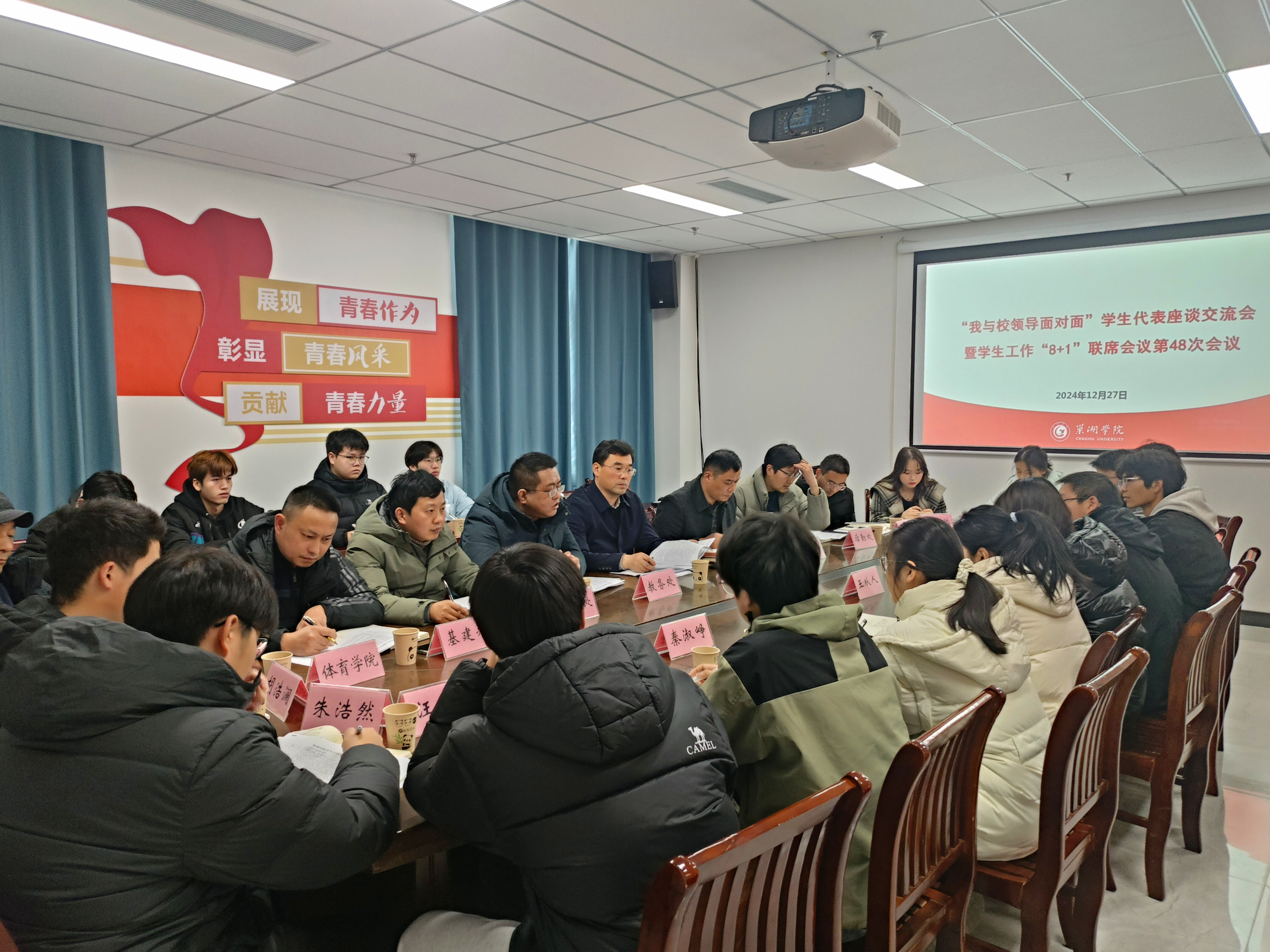 2024年12月27日,校党委副书记宋立敏主持召开“我与校领导面对面”学生代表座谈交流会暨学生工作“8+1”联席会议第48次会议。他从现场听取的问题和意见建议谈起,为同学们送上了一堂影响深刻的思政课。宋立敏首先认真听取了参会学生反映的问题和提出的意见建议,接着充分肯定了他们对学校发展建设和自身成长成才的关心,希望大家能够以“主人翁”的姿态更多地参与到学校民主管理和各项事业发展中来,真正做到自我教育、自我管理、自我服务。最后,他对同学们提出了三点期望:一是好好学习,健康成长,努力成为党和国家的有用之才。努力学习,营造良好学风,提升校园活力,为校园增光添彩,勇担新时代赋予大学生的重要责任与使命;二是珍惜时光,用好平台,更好地提升自己主宰未来的能力和素质。充分利用好学校的平台,德智体美劳全面发展,全方位提升自身综合素质;三是管好自己,养成习惯,用自己的正能量影响身边人。要从一点一滴的小事做起,养成良好习惯,形成良好的示范带头作用。