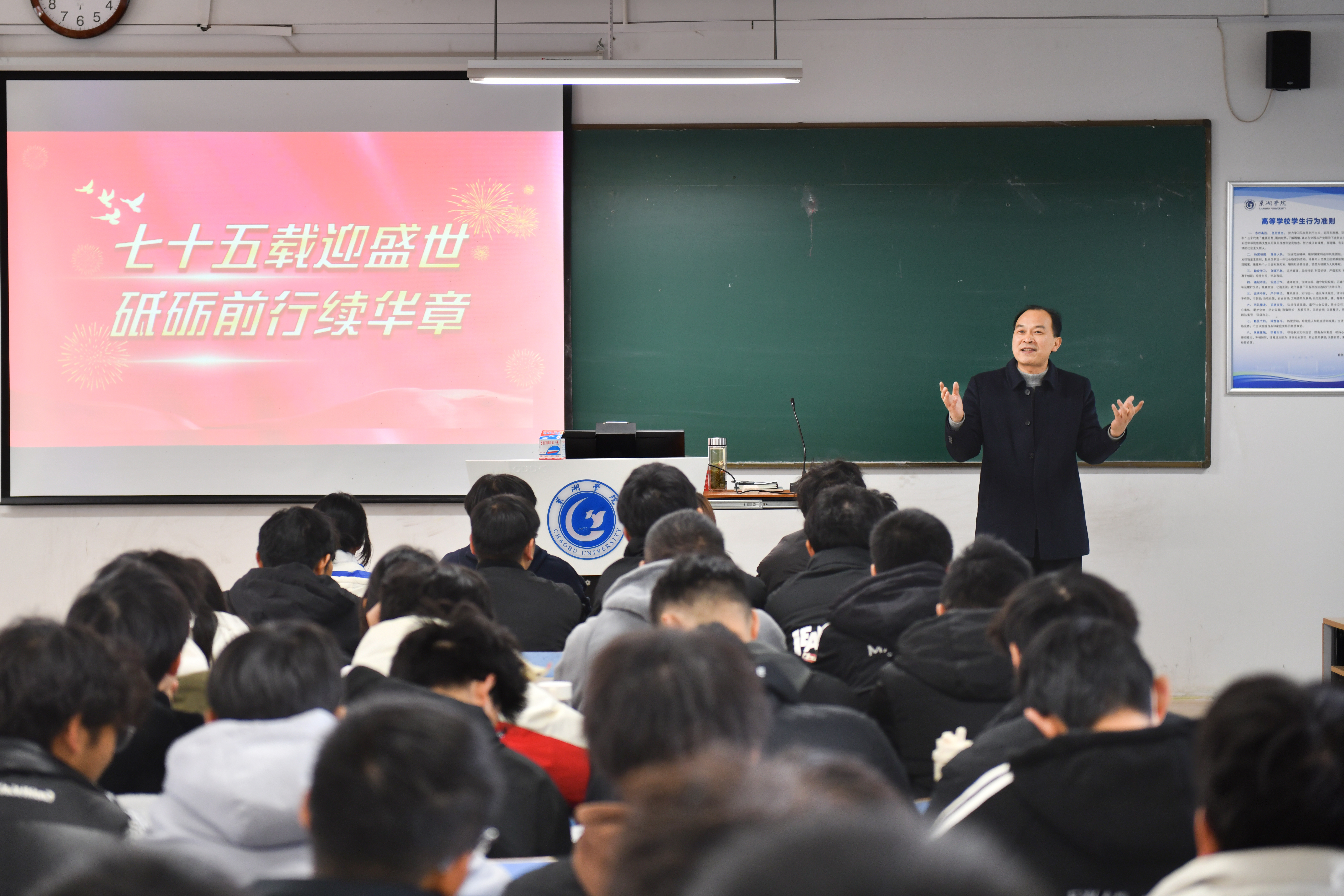 2024年11月7日,校党委委员、宣传部部长张连福为机械工程学院2024级机械电子工程班学生讲授形势与政策课。张连福以“七十五载迎盛世 砥砺前行续华章”为主题介绍了新中国成立以来中华民族发展的整体脉络,并以问题互动方式详细阐述了中国在经济、政治、文化、民生和生态文明建设领域取得的辉煌成就。在讲授过程中,他结合学校师资优势和实践教学基地优势,通过深入剖析学生身边的典型案例和鞭辟入里的生动讲解,大大激发了学生的民族自豪感和自信心。此外,他勉励学生要自觉做好未来发展规划,要以钉钉子精神和锲而不舍的坚韧打牢坚实的知识基础、锤炼过硬的本领、培养良好的综合素养,为强国建设、民族复兴演绎青春,奉献热血。