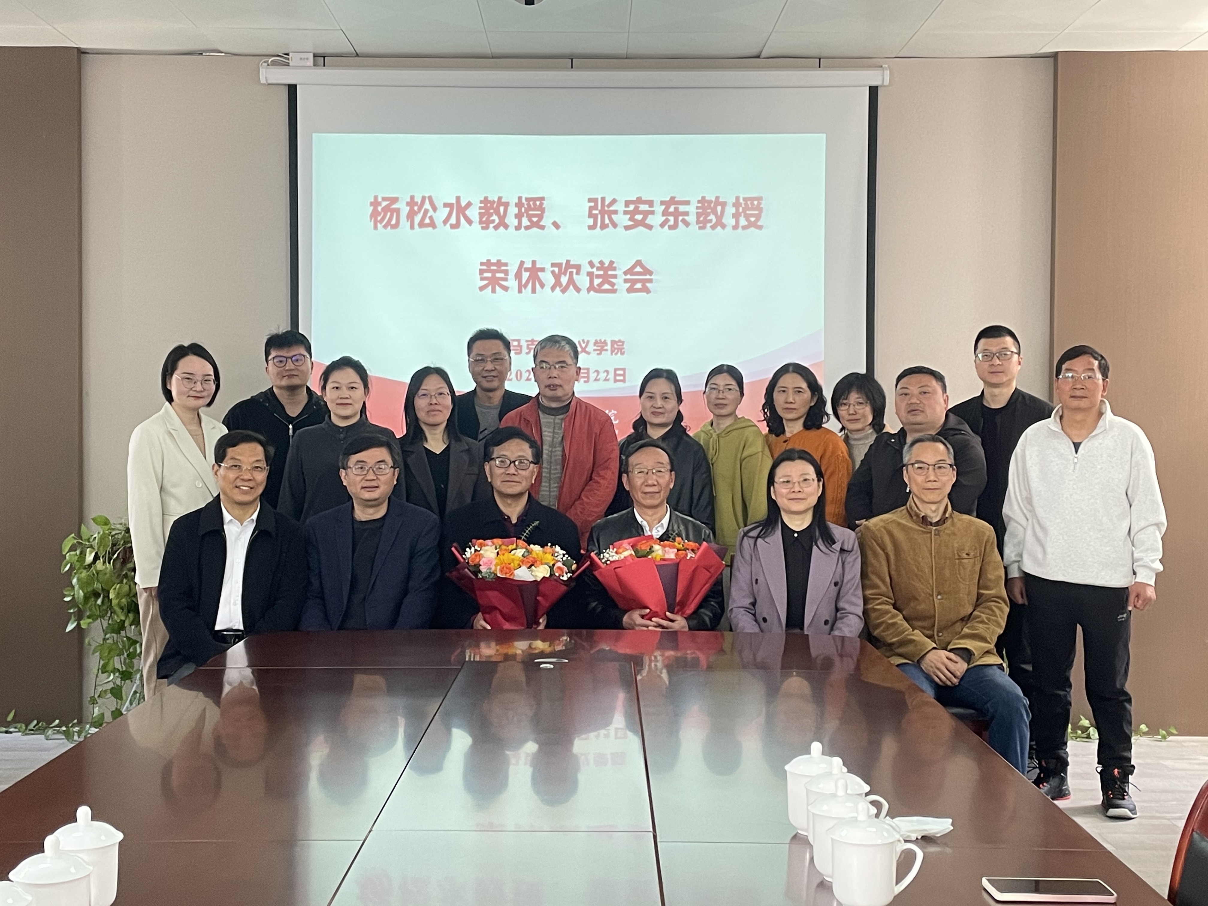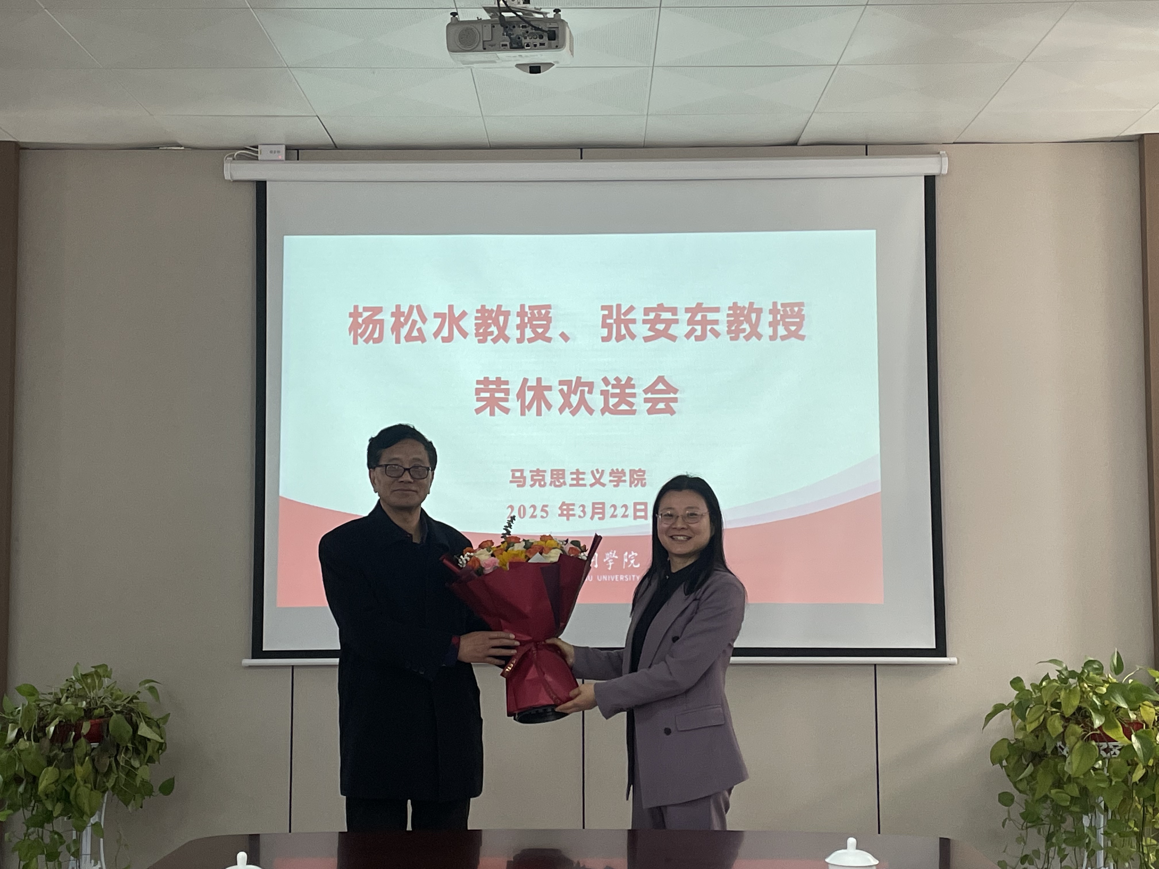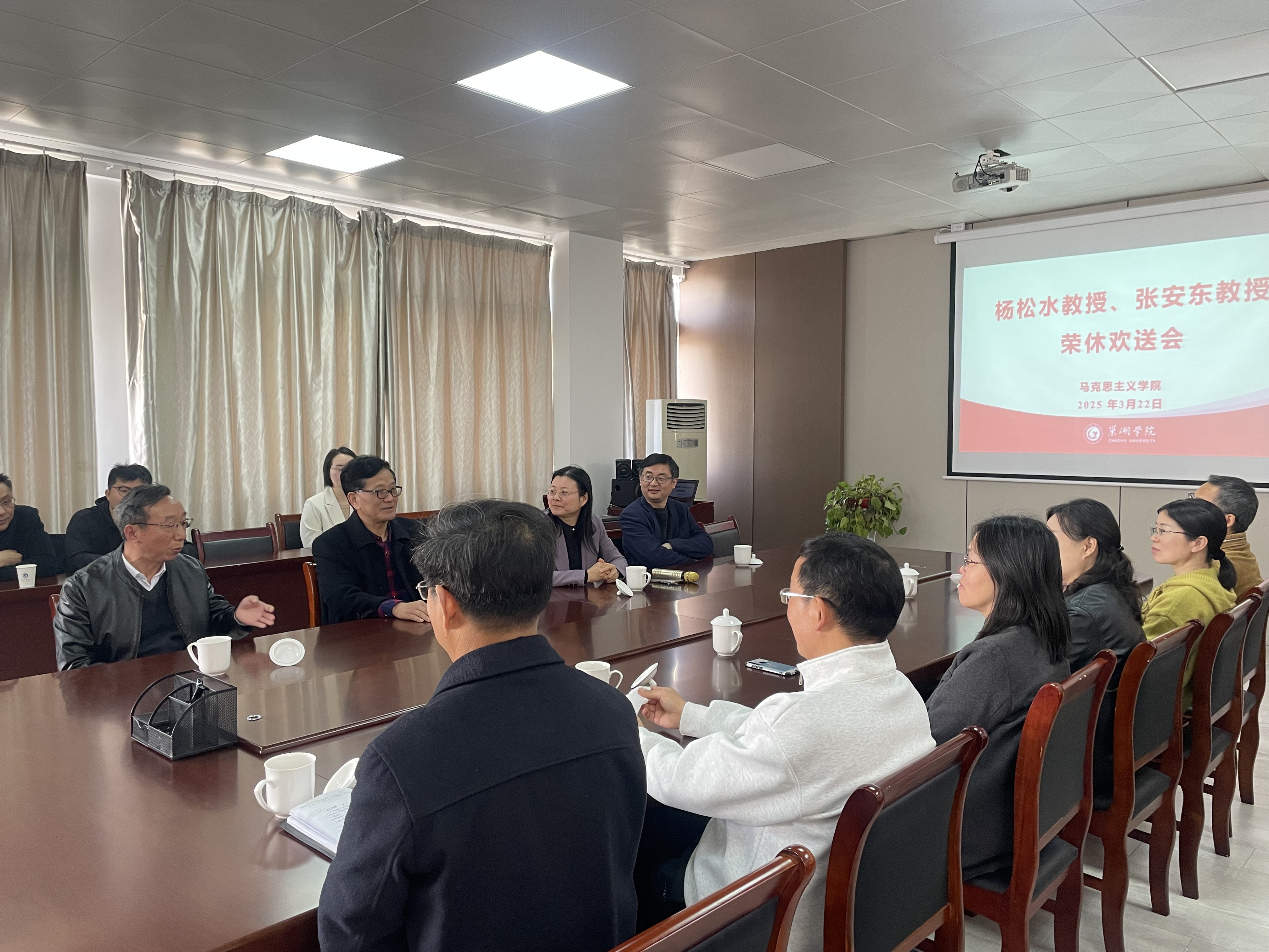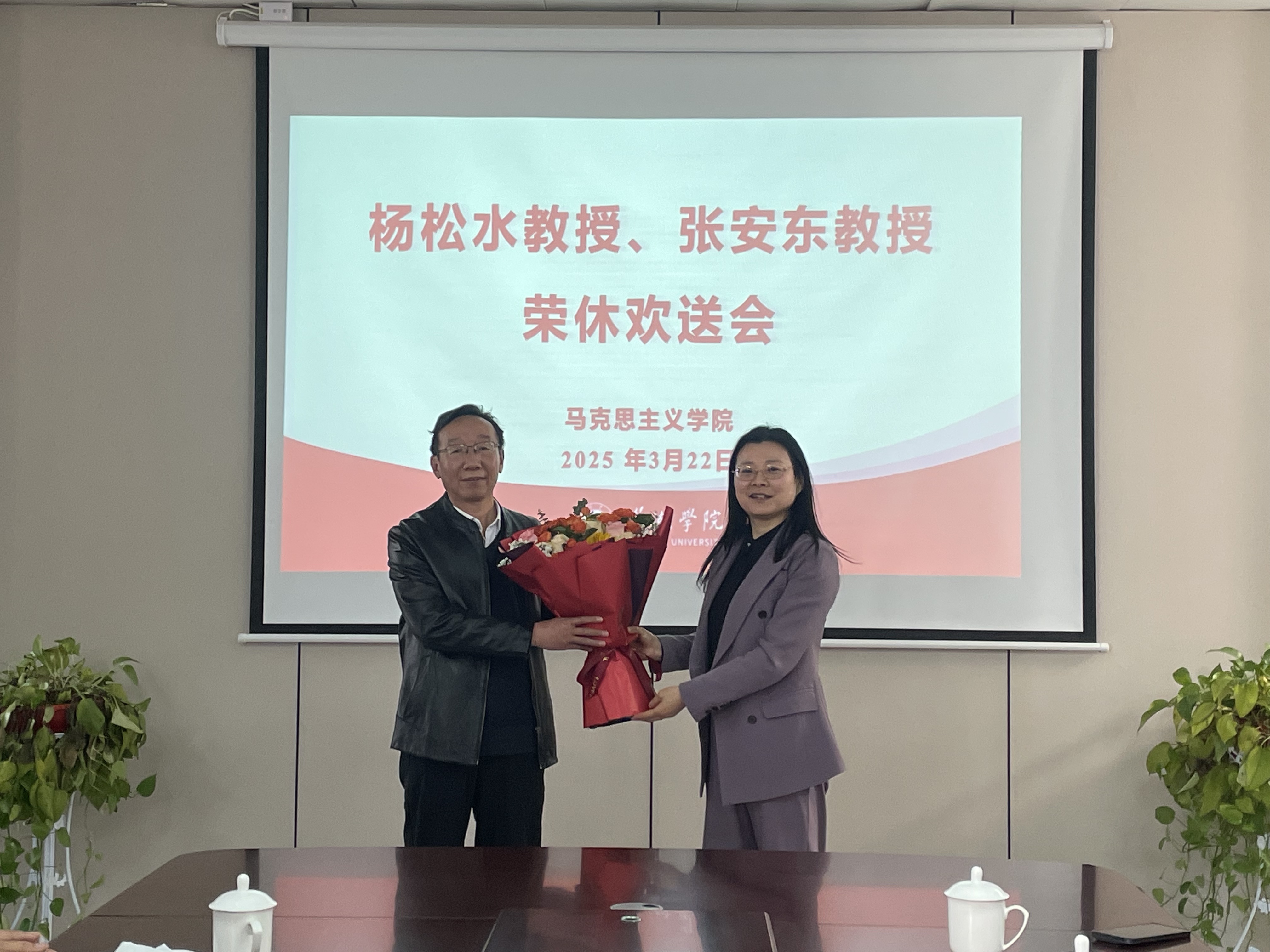 2025年3月22日,马克思主义学院在艺术楼三楼会议室举办荣休教师欢送会,向荣休的杨松水、张安东两位教师送上敬意与祝福。马克思主义学院领导班子成员与教师代表参加欢送会,欢送仪式由学院副院长、分工会主席石庆海主持。