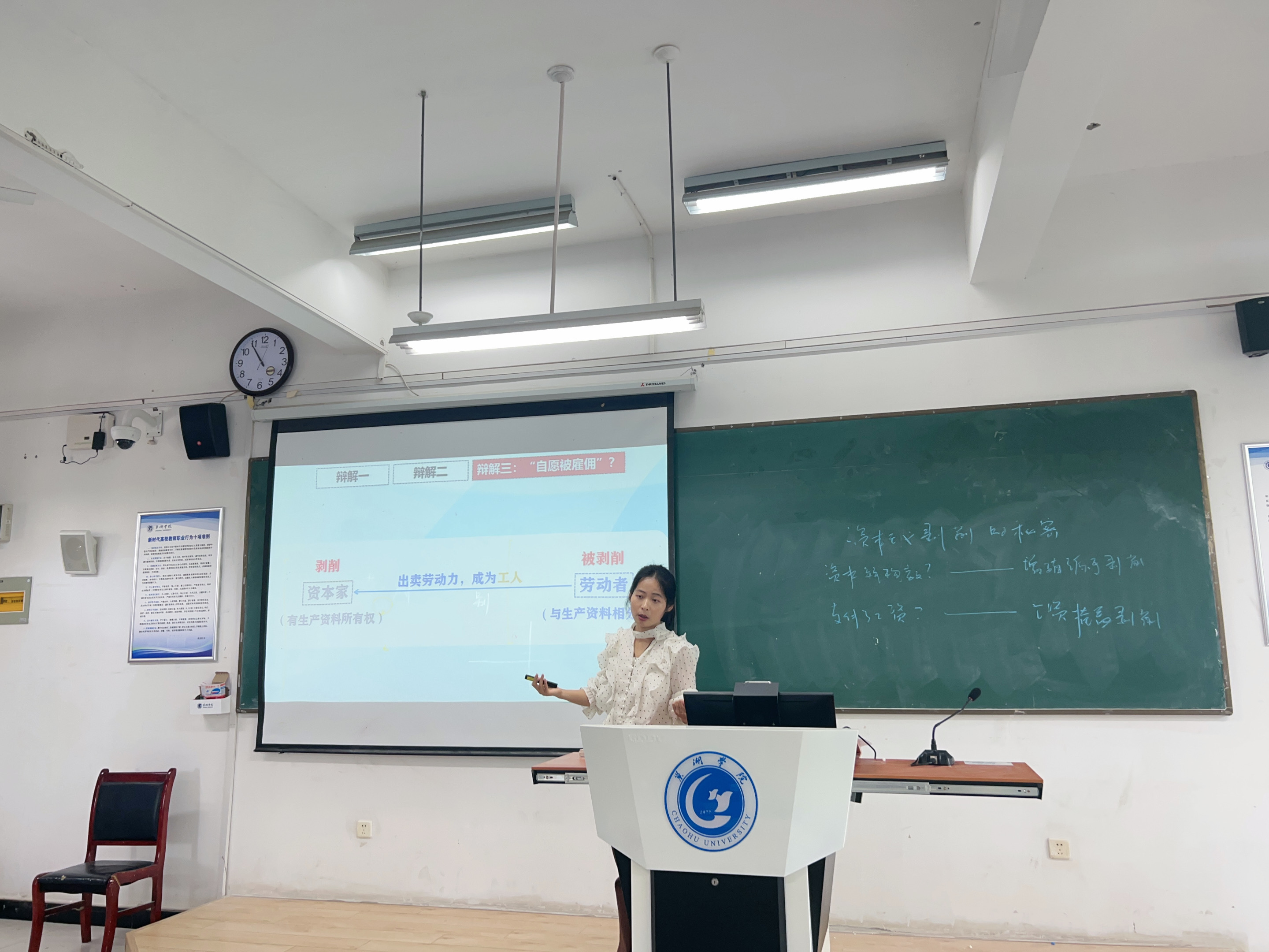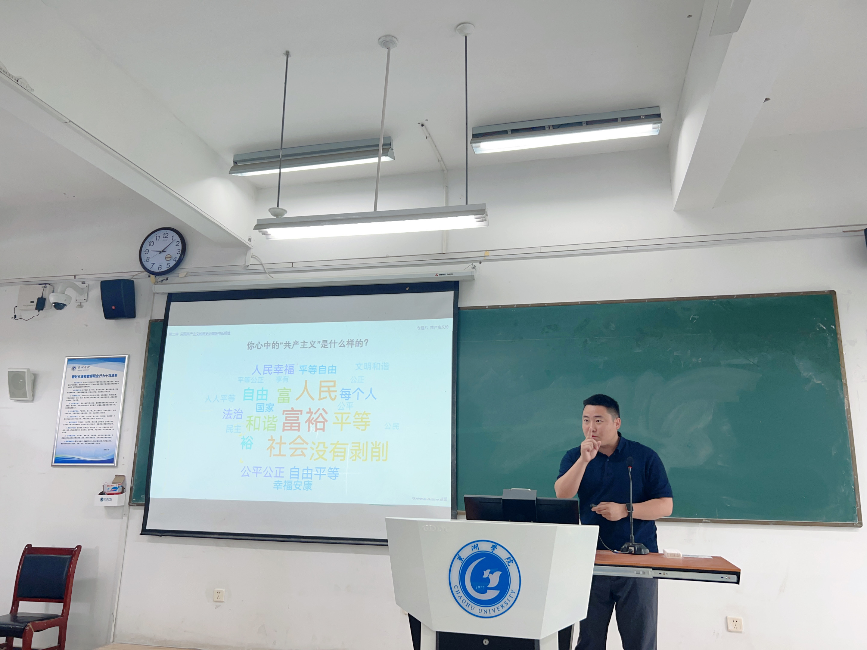 比赛现场,9位参赛教师一一上台展现自己的教学风采:吴卿老师以“马克思的剩余价值理论”为题,分析了资本的本质与资本主义经济制度的本质;张智慧老师以“新时代青年应该树立怎样的人生追求”为题,剖析了当代青年应树立“服务人民、奉献社会”的正确人生追求;金辉老师以“共产主义远大理想及其实现”为题,解释了什么是以及如何实现共产主义的远大理想;徐二花老师以“大学生学法懂法的重要性”为题,阐述了法的内涵和学法的意义;廖梦琦老师以“‘开眼看世界’的历史重要性”为题,分析了晚清以来国人思想的渐变过程和历史意义;姚钰婷老师聚焦“共同富裕”,讲述了为什么要实现共同富裕以及共同富裕的特定内涵;宋玉荃老师以“揭示资本主义剥削的秘密”为题,诠释了剩余价值的生产过程;丁贝贝老师以“制胜未来的战略之举——发展新质生产力”为题,解析了新质生产力的内涵、特征和发展路径;付加佳老师以“马克思实践观——穿透数字迷雾 破解认知困境”为题,解读了马克思主义实践观的具体理论内涵。
