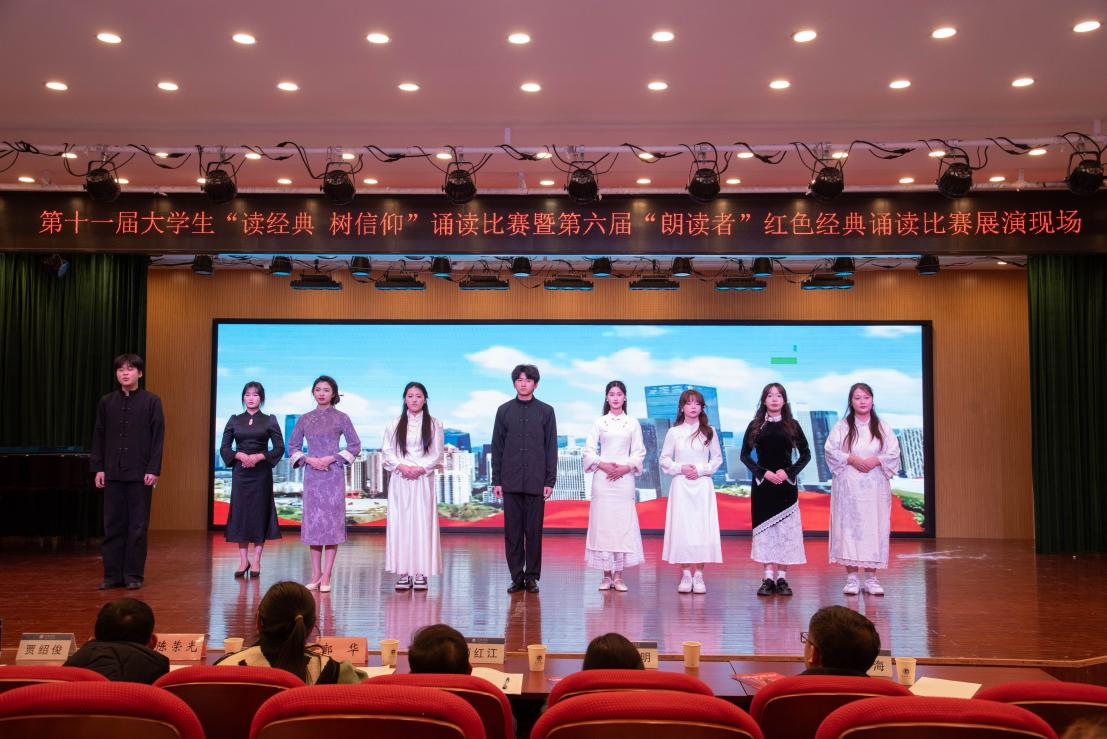 (一)“读经典,树信仰”诵读比赛活动:活动通过配乐朗诵、情景演绎等创新形式,生动展现对中华经典文化的传承。该活动既培养了学生的朗诵兴趣,又通过经典解读提升了语言表达、审美等人文素养,丰富了校园文化。比赛彰显了新时代青年传播中国精神、讲好中国故事的担当,为校园注入了文化活力。