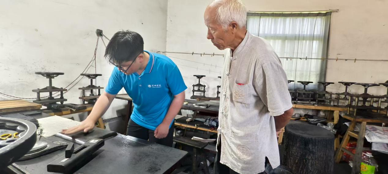 在水墨山水之间,一缕松烟幽香穿越时光。实践团成员随后来到了上庄胡开文墨厂,见到了徽墨第八代传承人胡嘉明老先生。跟随着胡老的脚步,实践团成员们走进了制墨间,并有幸亲身体验古法徽墨制作中的锤打、塑形、入模、修边、描金等步骤。“锤打是我们想让同学们体验的关键环节,一锭徽墨的产生要经过上千次的锤打,只有如此,墨条才不容易开裂。”胡嘉明先生说道,“徽墨制作步骤打不得半点折扣,徽墨的产生要经过‘千锤百炼’,这和做人是一样的,只有经历无数次的磨砺,才能变得沉稳、坚毅。”徽墨制作是一门精妙绝伦的艺术,从炼烟到描金每一步都饱含匠心,这才成就了徽墨一点如漆、万载存真、入纸不晕的特点。