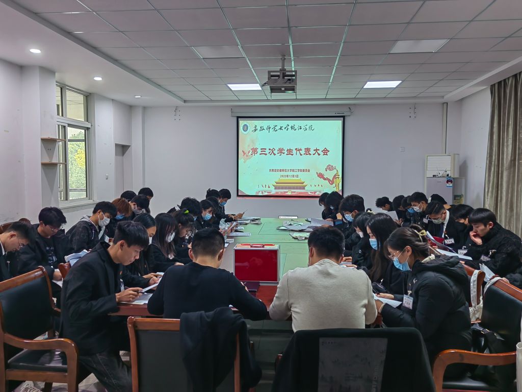 本网讯 在全院上下深入学习宣传贯彻党的二十大精神之际,12月3日,安徽师范大学皖江学院第三次学生代表大会在东二五楼报告厅顺利召开。院党委副书记、副院长王传辉,院党委委员、学工部部长张铮,院团委书记邵敏,各系团总支书记以及130名学生代表参加会议。