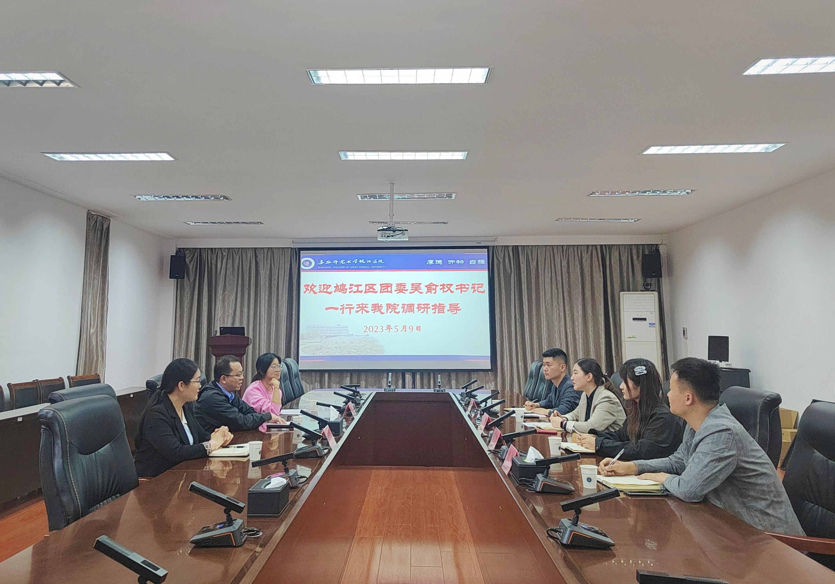 5月9日下午,鸠江区团委吴俞权书记一行来我院调研交流,院团委书记邵敏主持座谈会,电子工程系团总支书记刘杰、经济系团总支书记祝松、院团委王磊等参加座谈。
