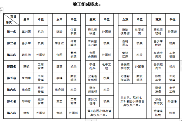 教工组:男子单打、女子单打、男子双打、女子双打、混合双打。(文/李德成