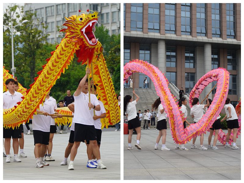 舞龙表演精彩登场,二十余名队员手持舞龙棍,将金粉双龙舞动地活灵活现,巨龙腾空,气势磅礴,奔跑穿梭、跳跃舞动、摇摆盘桓、环环相扣,场面十分震撼。