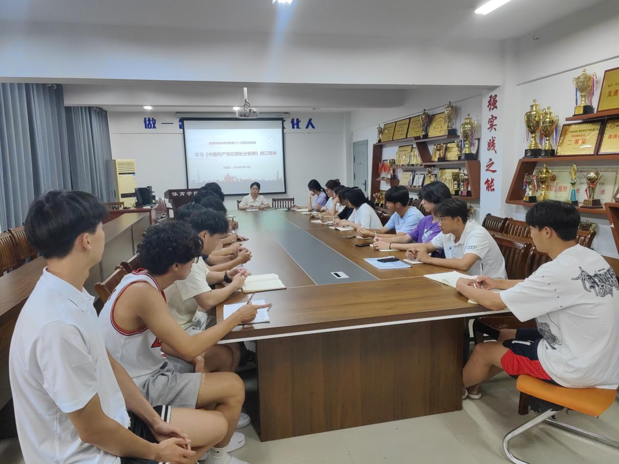 为强化入党积极分子的纪律意识,增进对党的认识,6月14日,体育学院第三十三期党课培训第三讲在体育学院会议室开展。本次培训由体育学院党委副书记朱春花授课,党课的主题是“学习《中国共产党纪律处分条例》修订精神”,体育学院2024年全体入党积极分子参加培训。