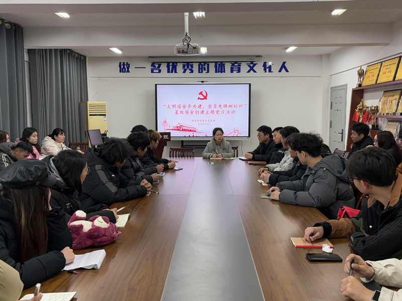 为充分发挥学生党员的先锋模范作用和党支部的战斗堡垒作用,进一步做好党员密切联系群众工作,2月25日中午,体育学院在学院会议室开展“文明宿舍齐共建 党员先锋树标杆”星级宿舍创建主题党日活动。此次活动由学生第一党支部副书记田中正主持,学院党委副书记、纪委书记朱春花,组织员张巧生以及全体学生党员、入党积极分子参加了此次活动。