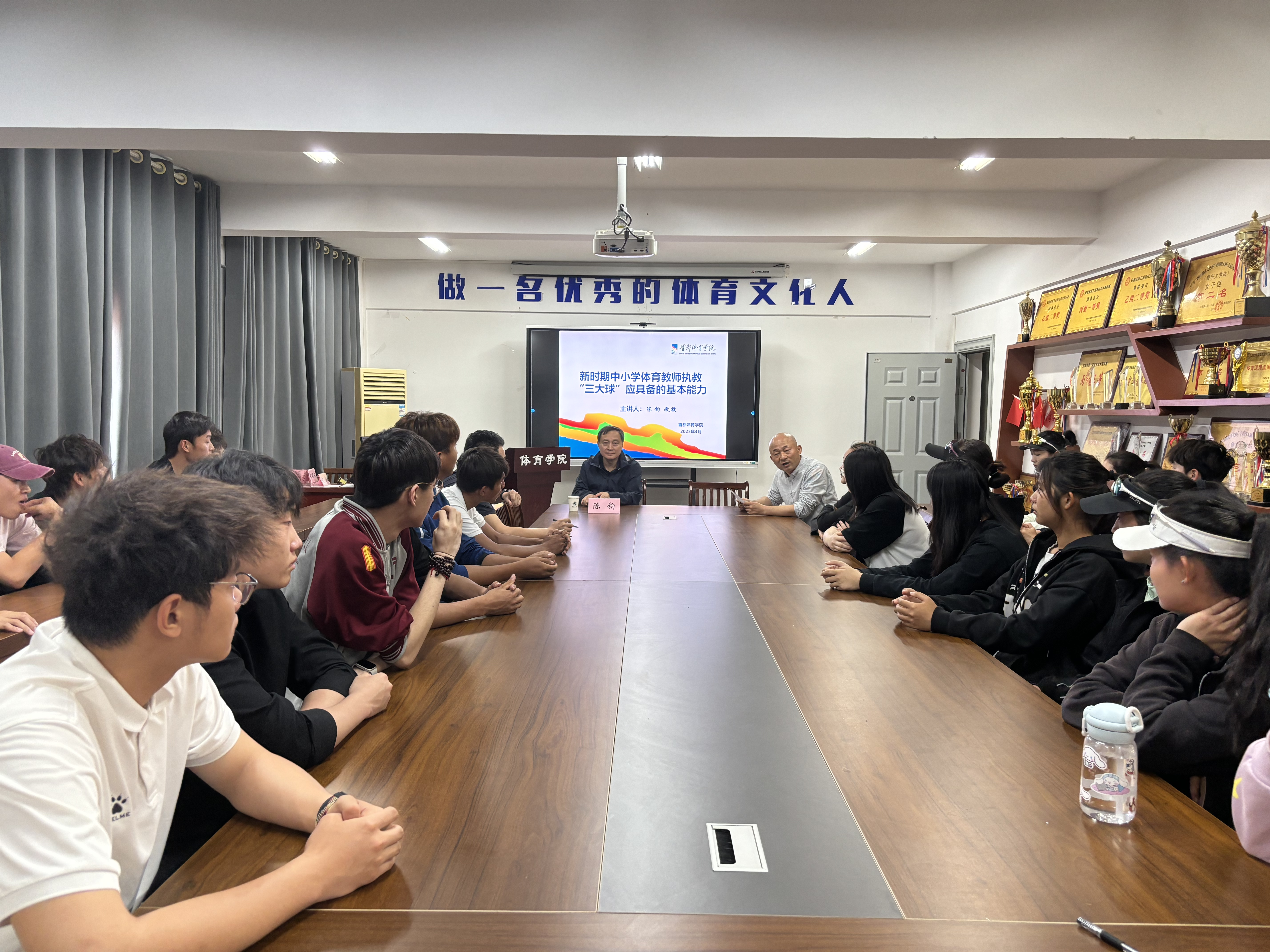 为深入探索校园三大球课余训练的发展路径,并进一步提升体育教师的执教水平,体育学院特邀首都体育学院的陈钧教授,于2025年4月28日在体育学院会议室开展了一场主题为 “新时期校园三大球课余训练的开展背景及体育教师执教能力提升” 的专题讲座。校篮球、排球(沙滩排球)、足球的全体队员与教练员均到场参加,讲座由体育学院院长赵胜国主持。