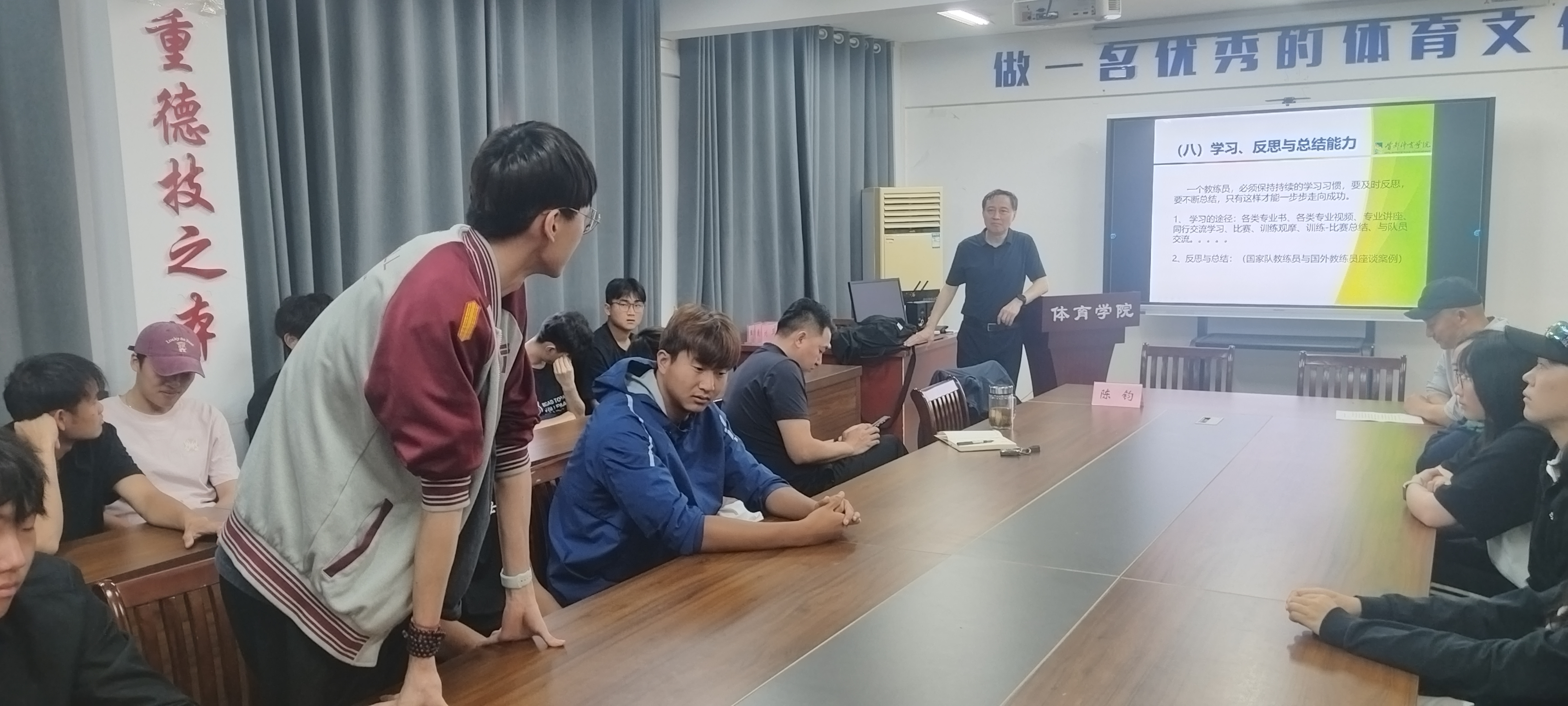 在交流互动环节,现场气氛热烈,师生们积极提问,陈教授一一耐心解答,针对三大球训练技术难点、课余训练与文化学习平衡、学生个体差异等问题给出实用指导,为三大球教学训练实践提供了新思路。