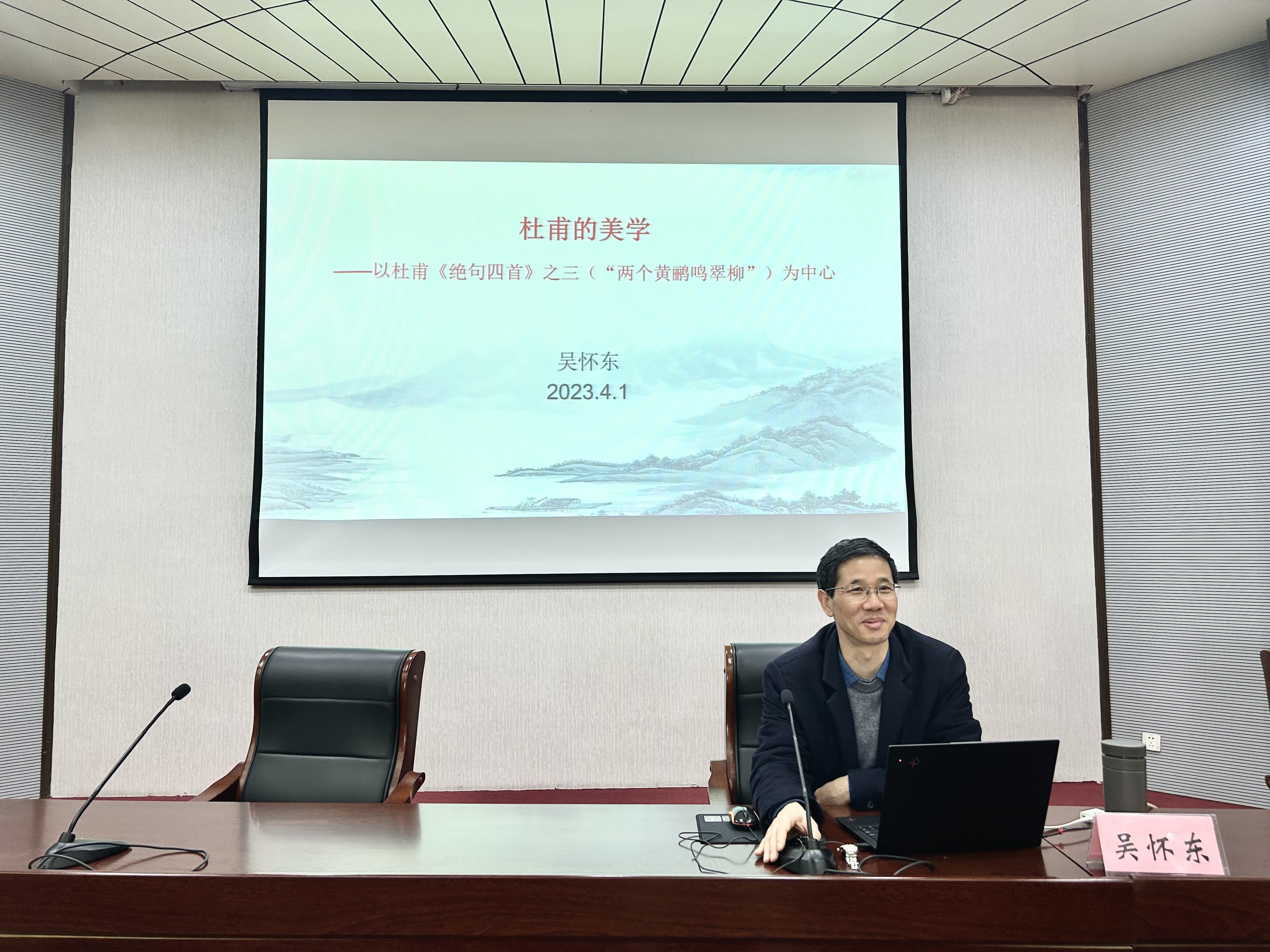 2023年4月1日上午,文学与传媒学院在致知楼开展汤山文学讲坛第四期学术讲座,安徽大学文学院院长、教授吴怀东应邀作题为“杜甫的美学”的学术讲座。一百八十余名师生慕名参加,讲座由文传学院党委书记袁凤琴主持。